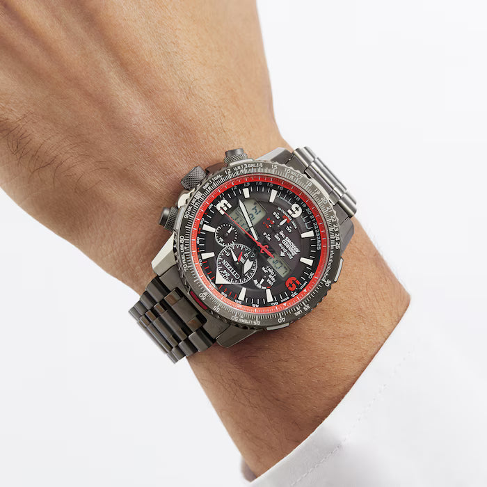 Citizen is proud to present its Limited Edition Red Arrows Skyhawk A.T timepiece. Thanks to its Radio-Controlled Atomic Clock Synchronisation Technology, this watch keeps incredibly precise time. The RAF Red Arrows Limited Edition insignia is engraved on the case back whilst its official logo appears on the dial. Limited to 1/9999 Pieces Worldwide and presented in a Limited Edition Presentation Box.