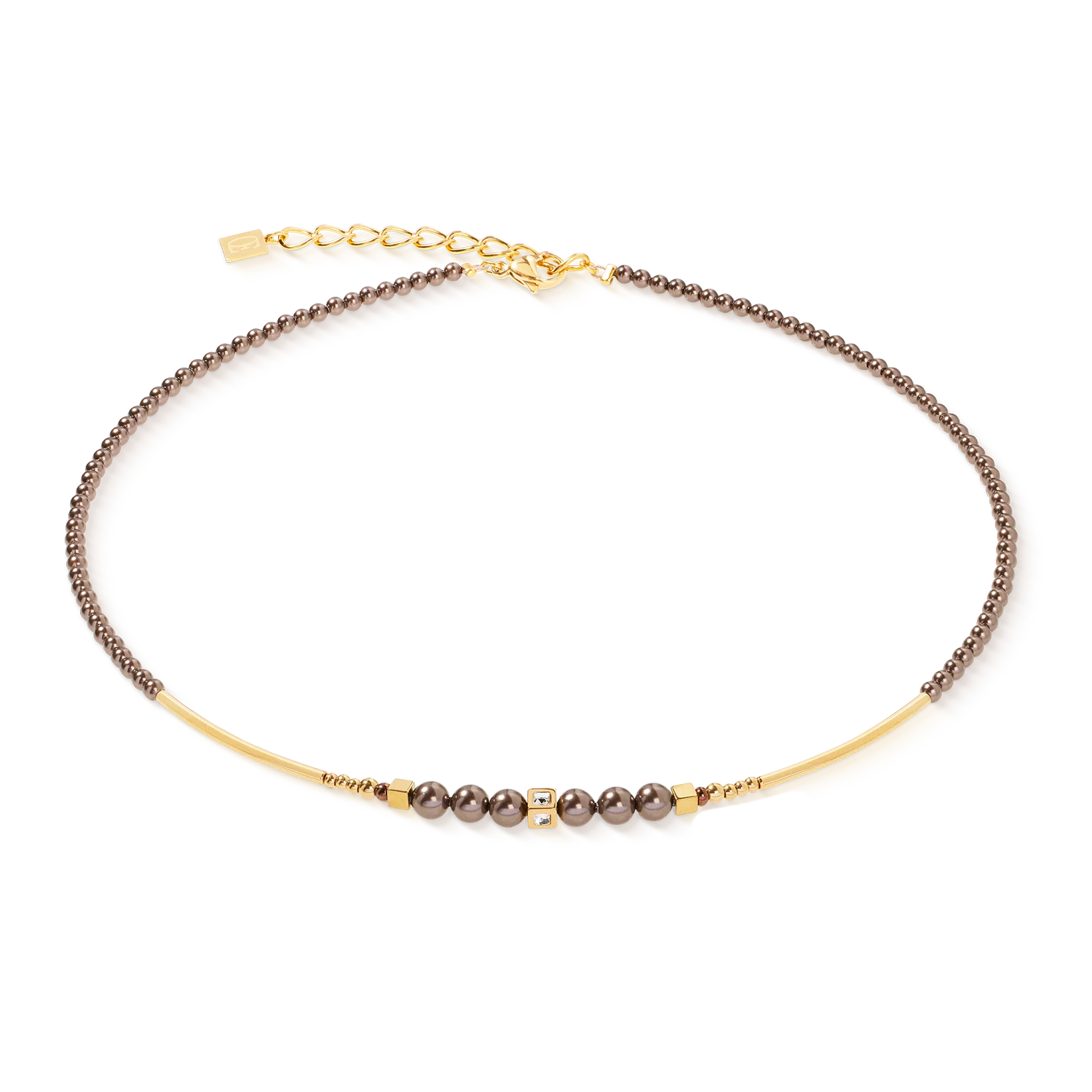 This exquisite piece features precious Crystal Pearls by Swarovski®, paired with hematite beads finished in titanium oxide and a gold-plated stainless steel cube adorned with a sparkling crystal at its centre. The combination of warm gold tones and shimmering brown hues creates a graceful look suited to both everyday wear and special occasions.