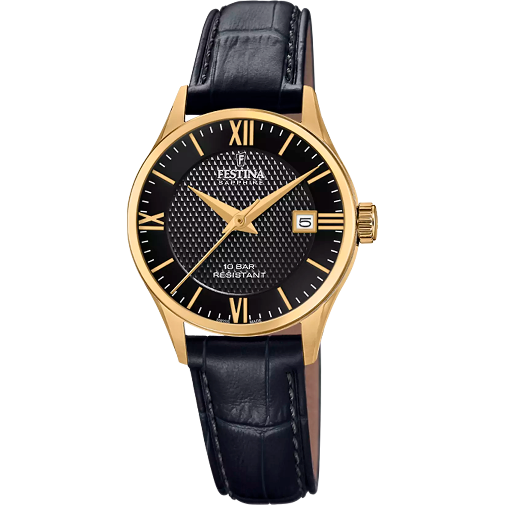 Festina Ladies Black Dial Gold Tone Watch. Leather Strap F20011/4. Swiss Made
