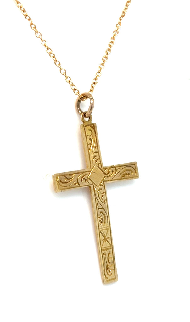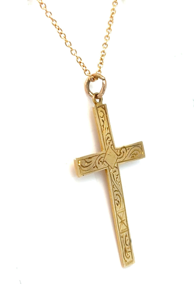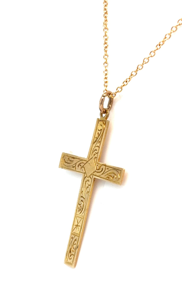 9ct Gold Engraved Cross Pendant & 18" Trace Chain. Fine Jewellery Gift. Pre Loved.