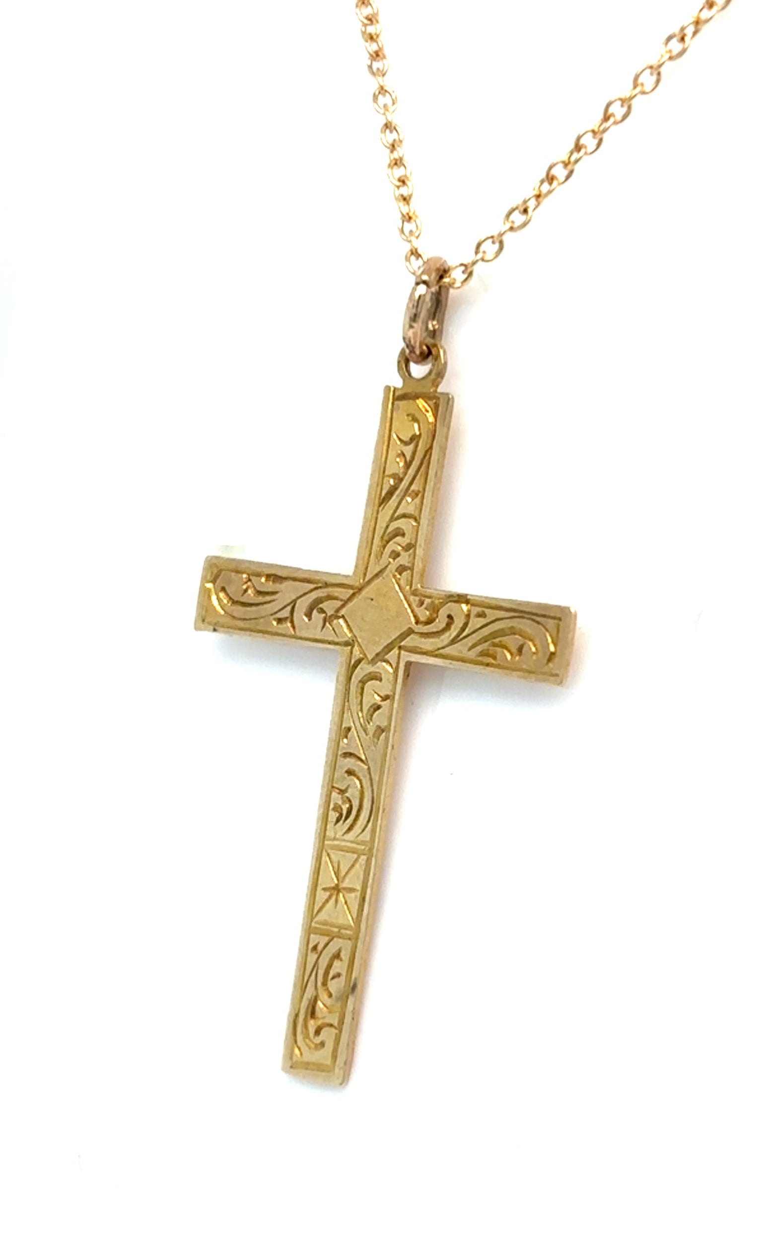 This elegant 9ct gold necklace features an engraved cross pendant on an 18" trace link chain. The secure bolt-ring fitting and classic cross design make it ideal for everyday wear or as a special gift. Suitable for men or women. A beautiful piece of fine jewellery with timeless appeal.