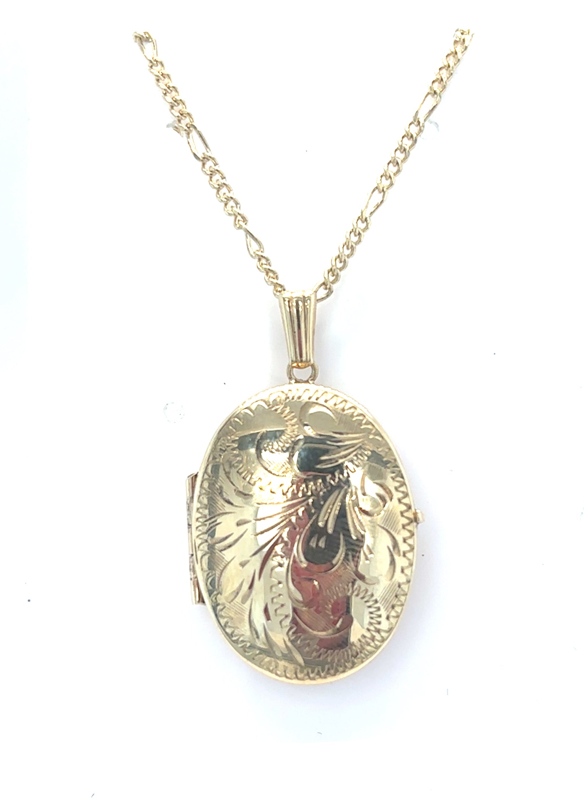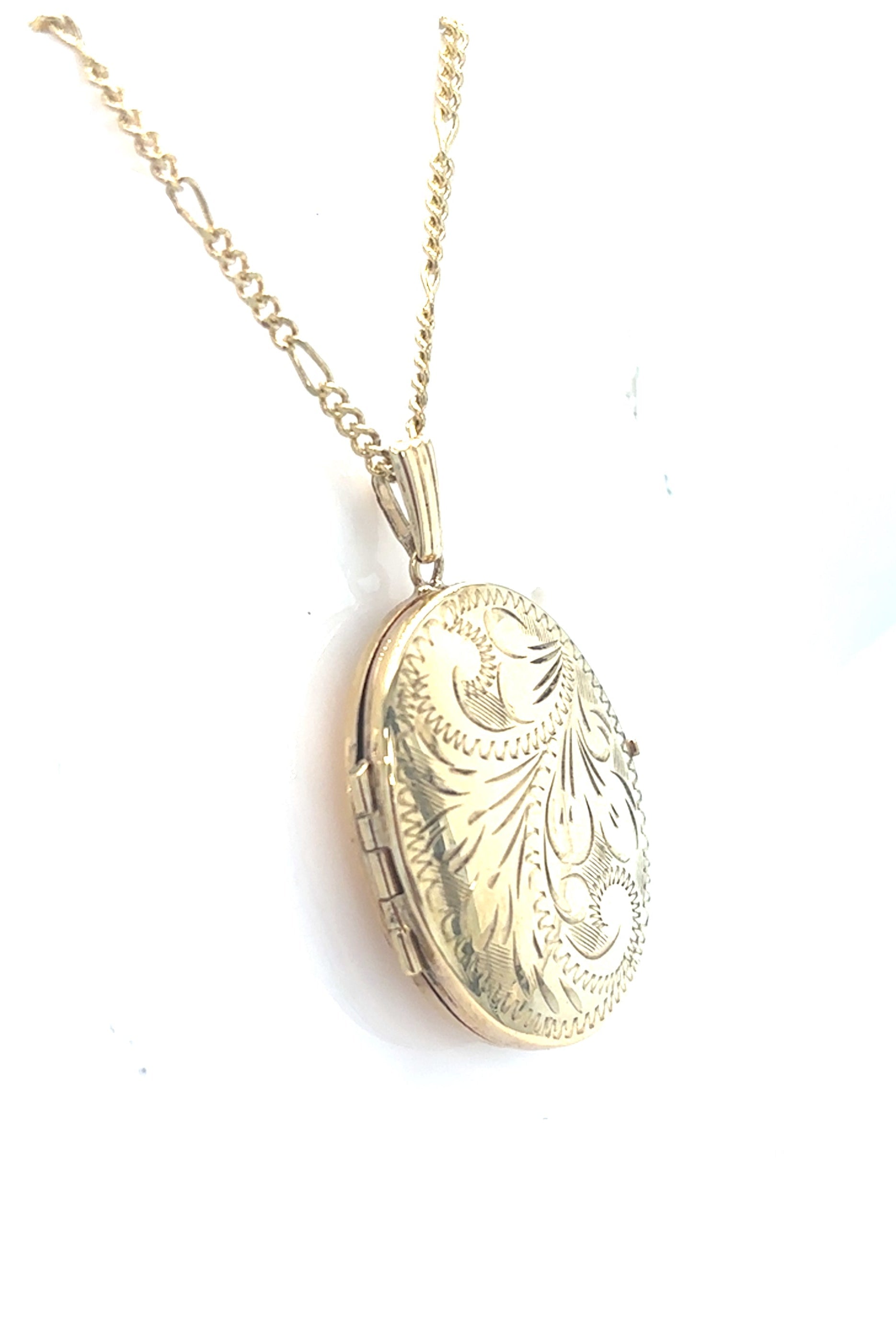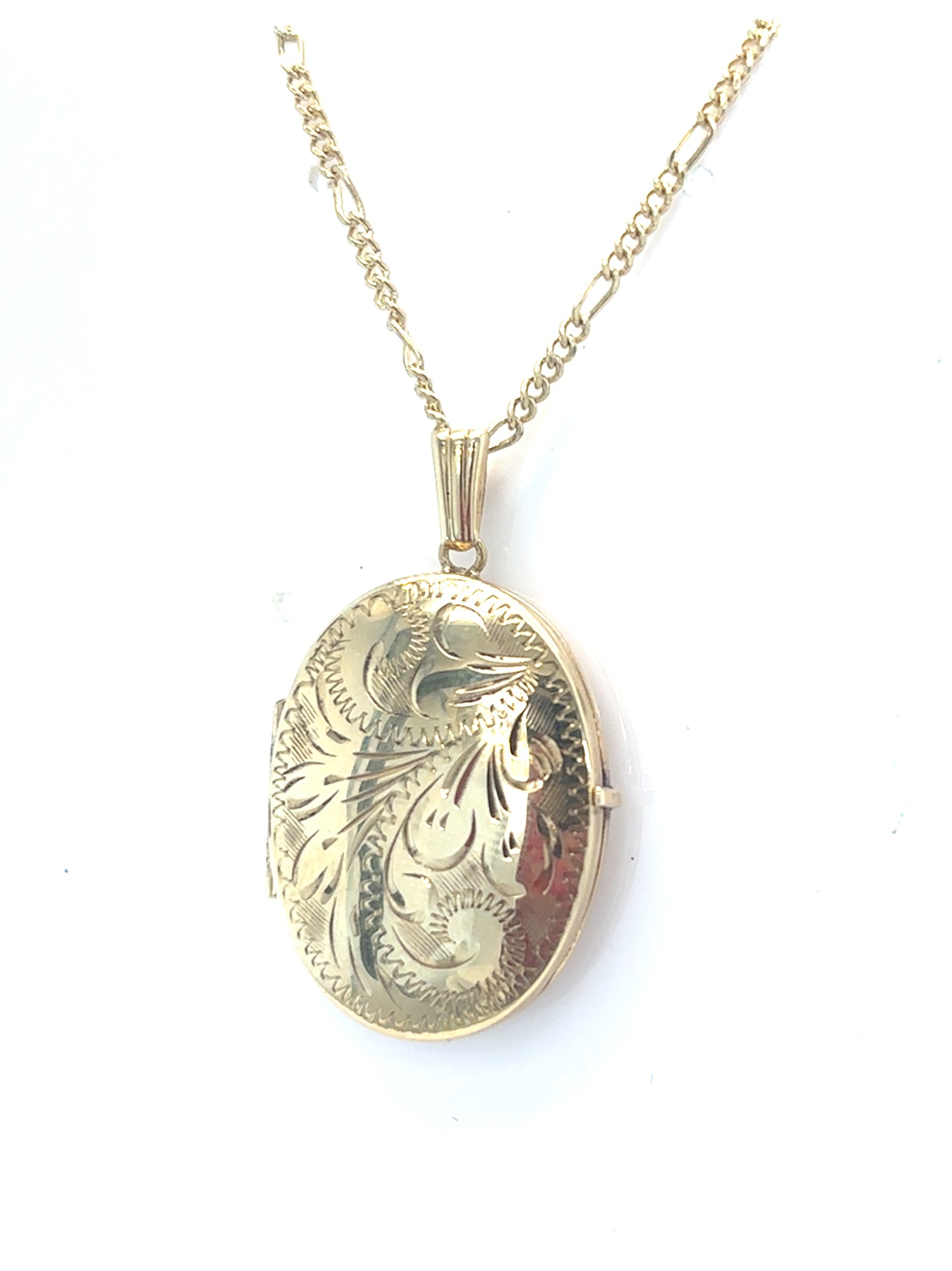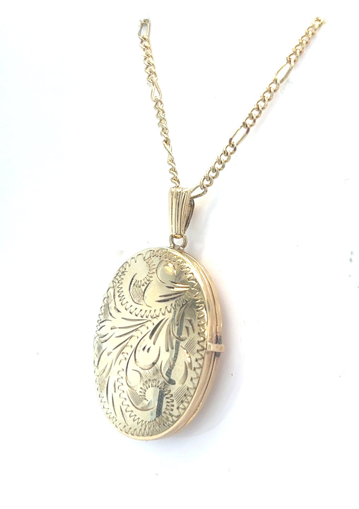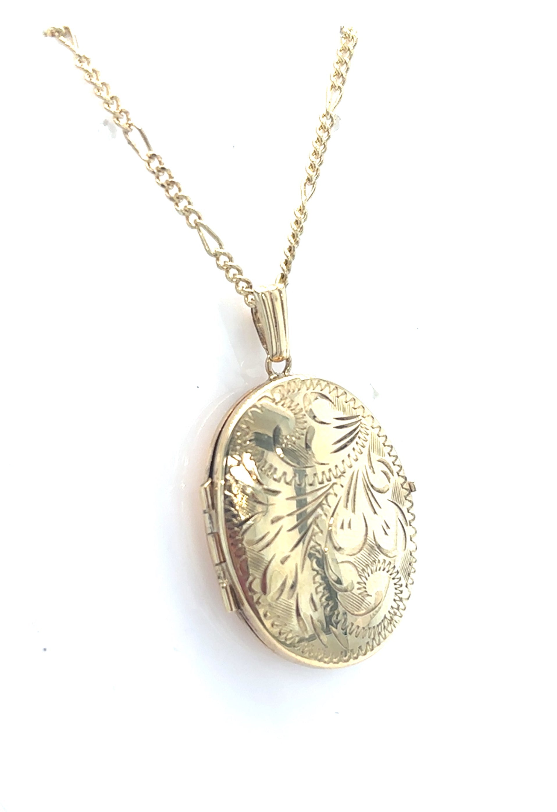 9ct Gold Oval Locket. Hand Engraved 26x21mm with 18" Figaro Chain. Photo Locket. Pre-Loved.