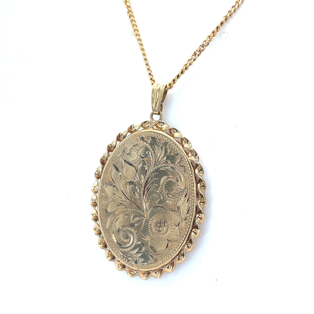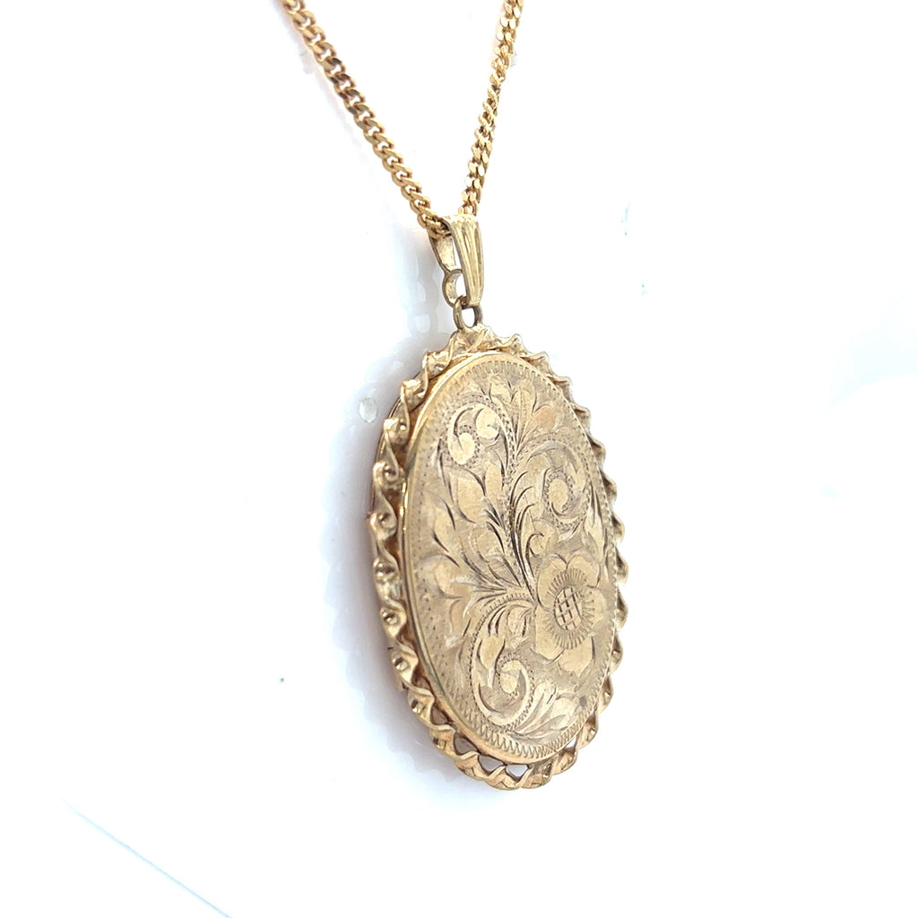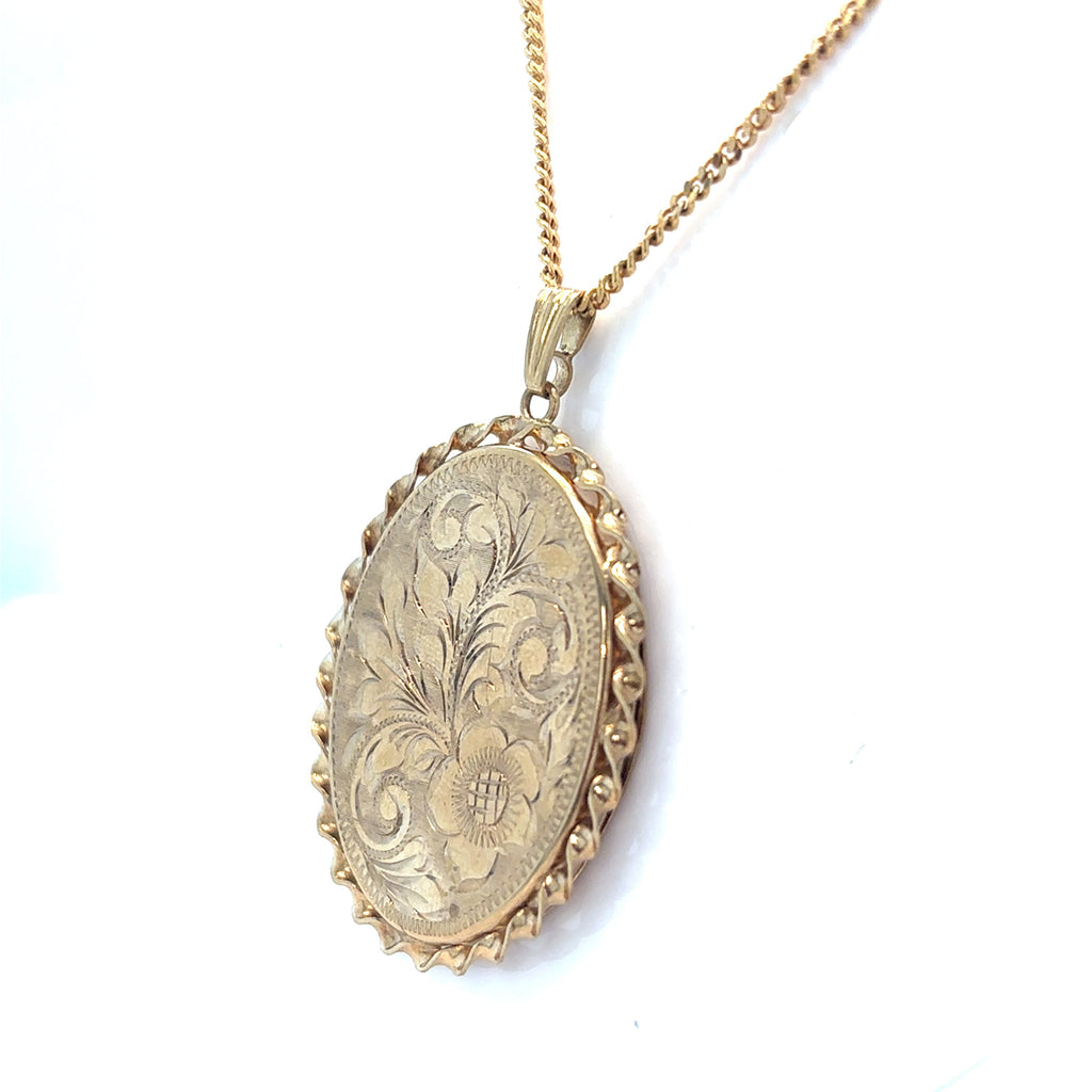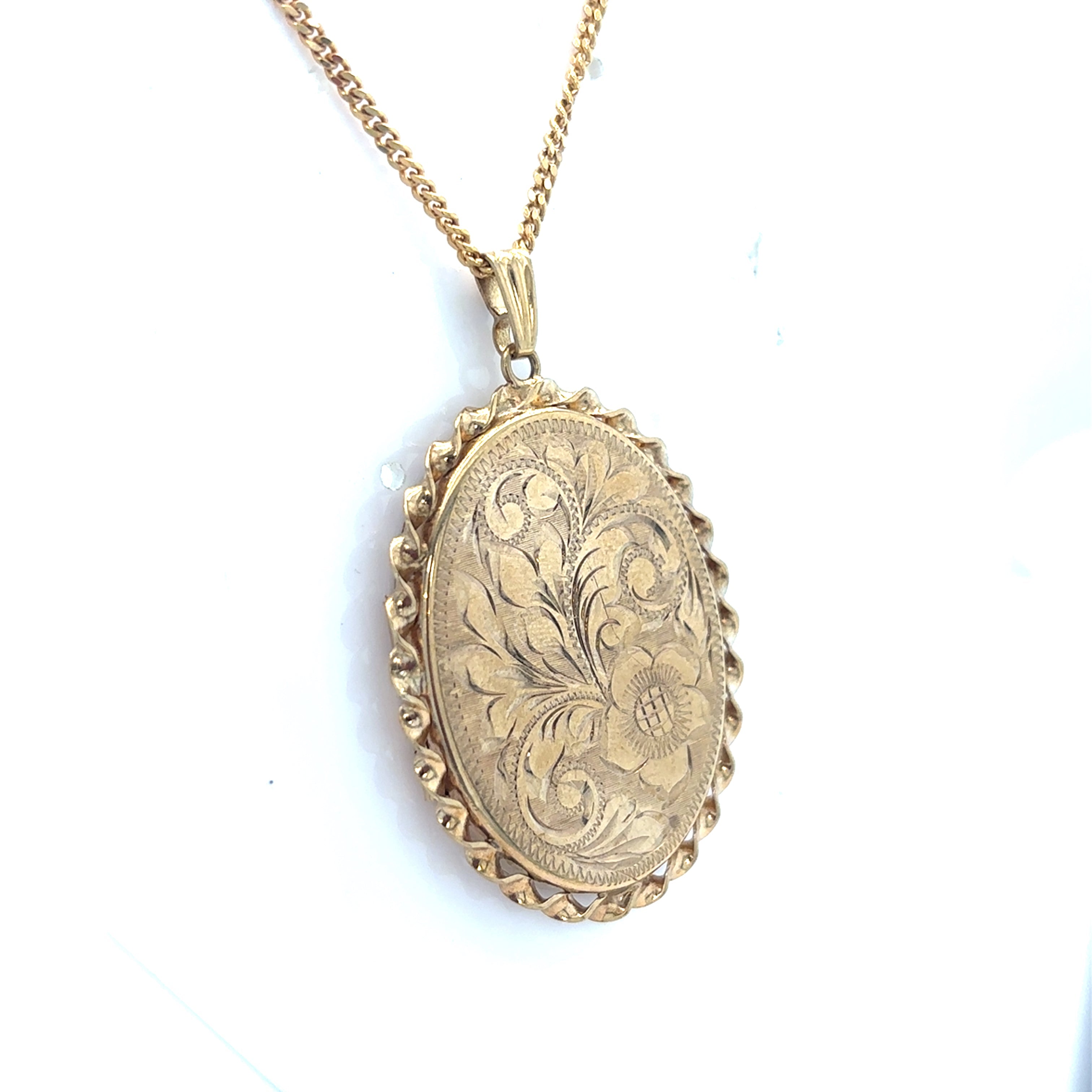 9ct Gold Oval Photo Locket 36x29mm Hand Engraved Rope Edge. 20" Curb Chain. Photo Locket. Pre-Loved.