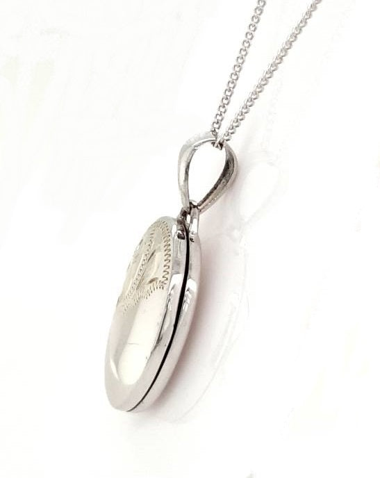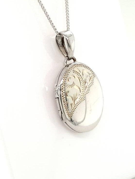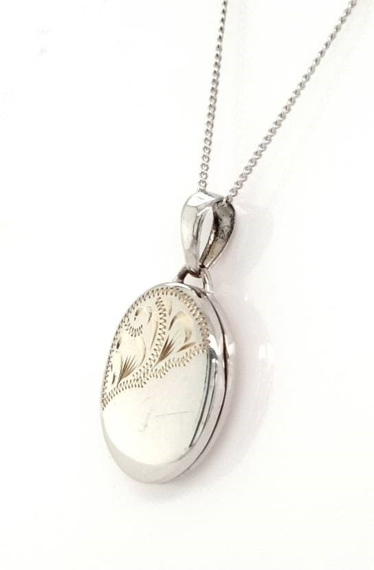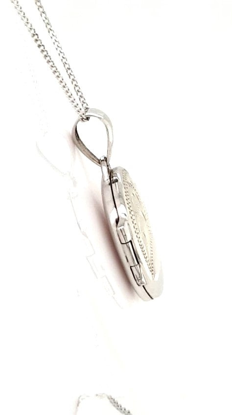 9ct White Gold Oval Locket. Hand Engraved 13x18mm with 18" Curb Chain. Photo Locket.