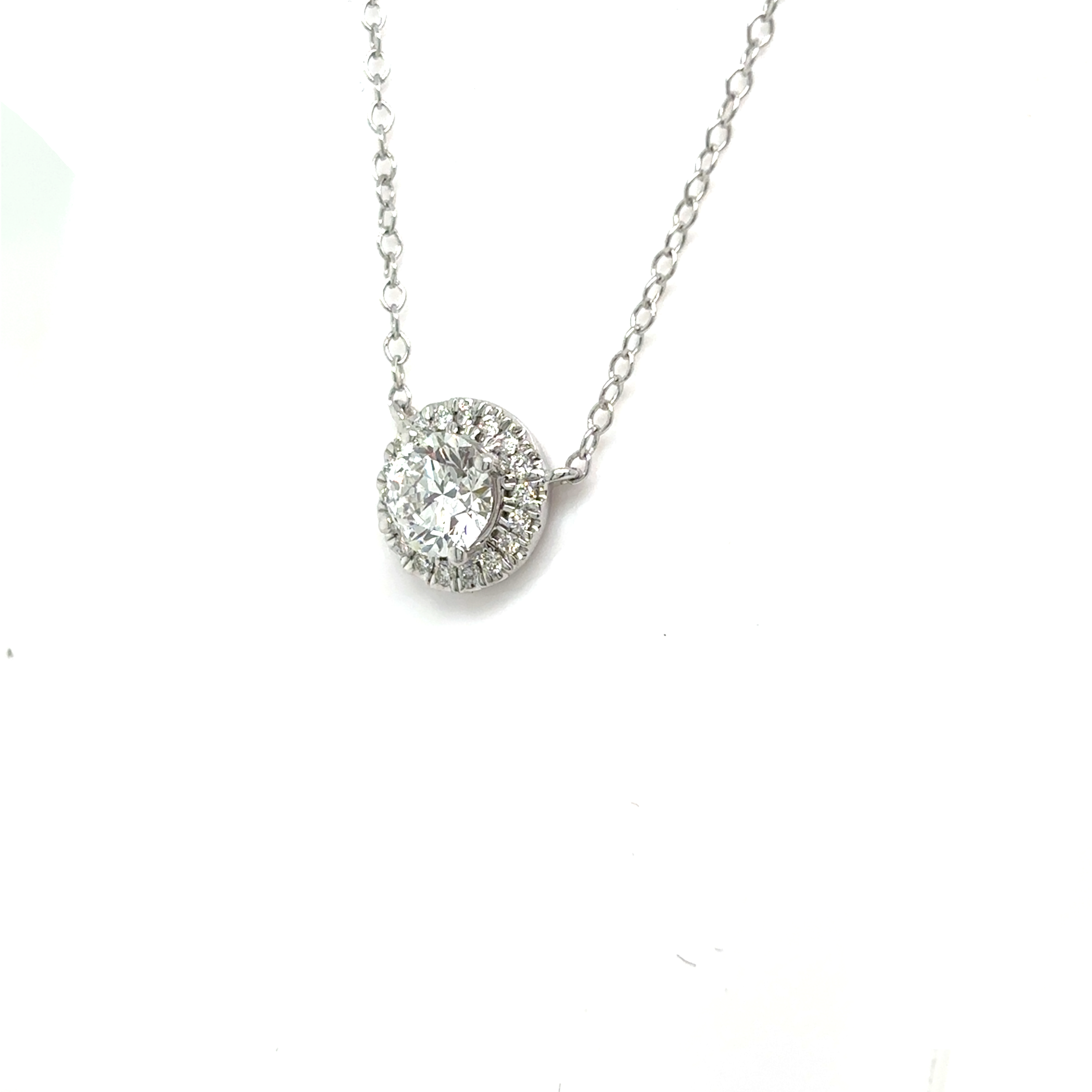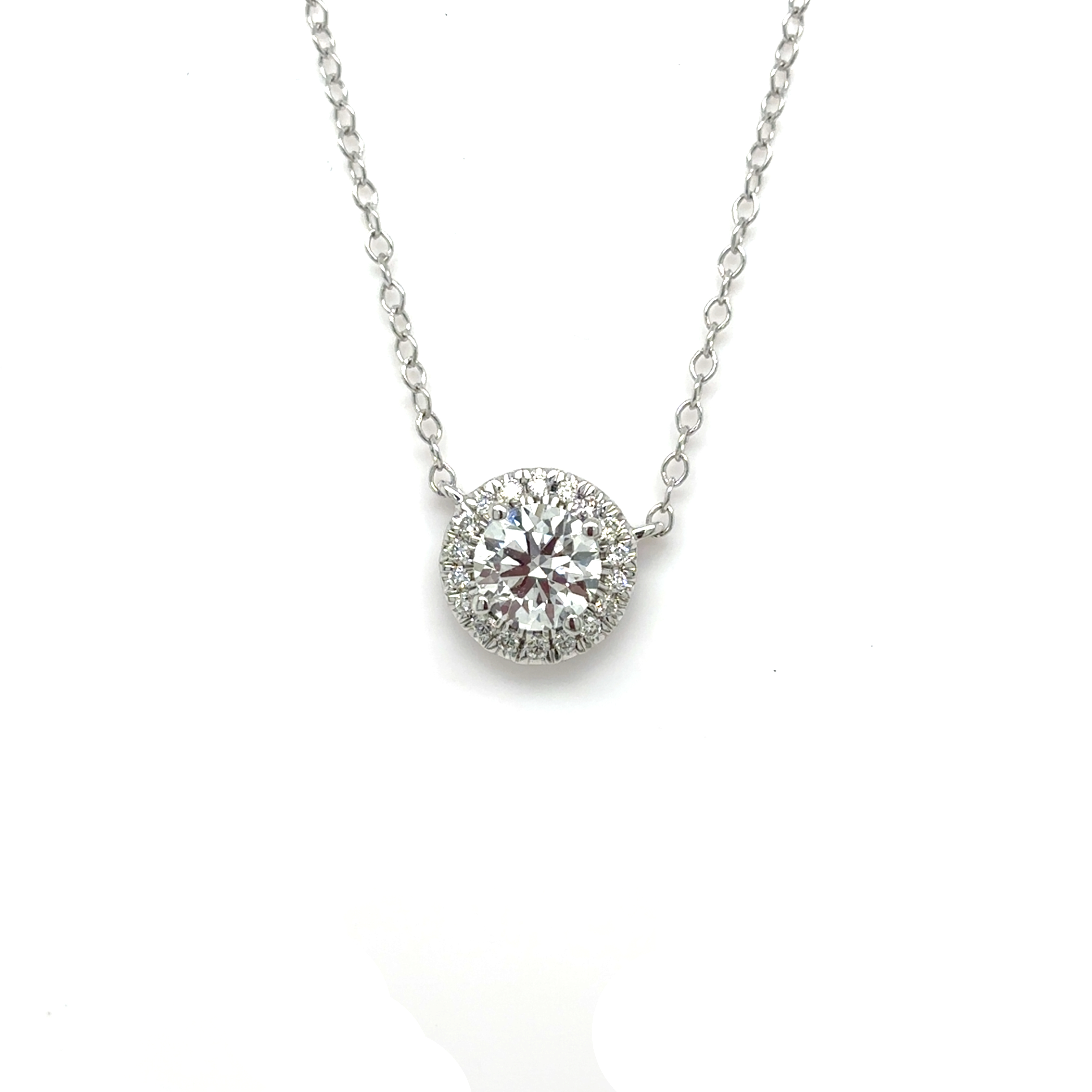 The pendant features a half-carat D colour, VS1 certified lab-grown diamond at its centre, surrounded by a delicate halo of lab-grown diamonds to enhance brilliance and fire.
