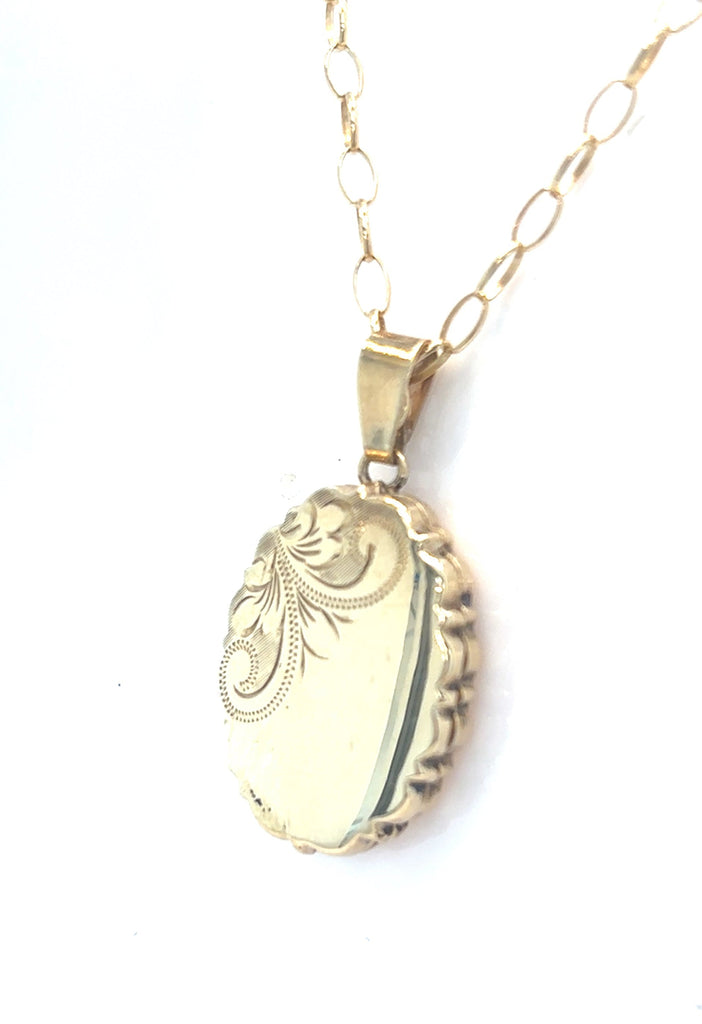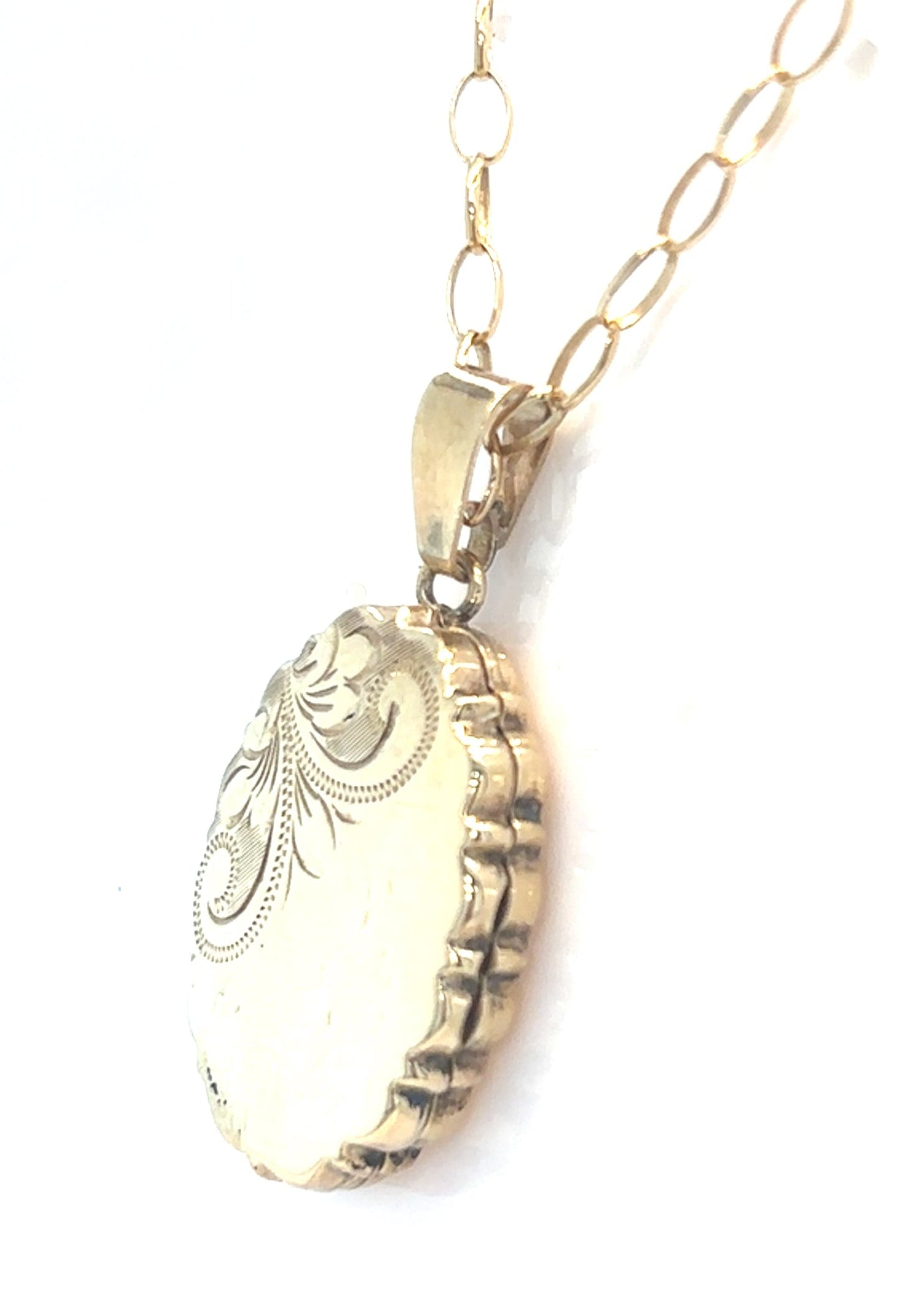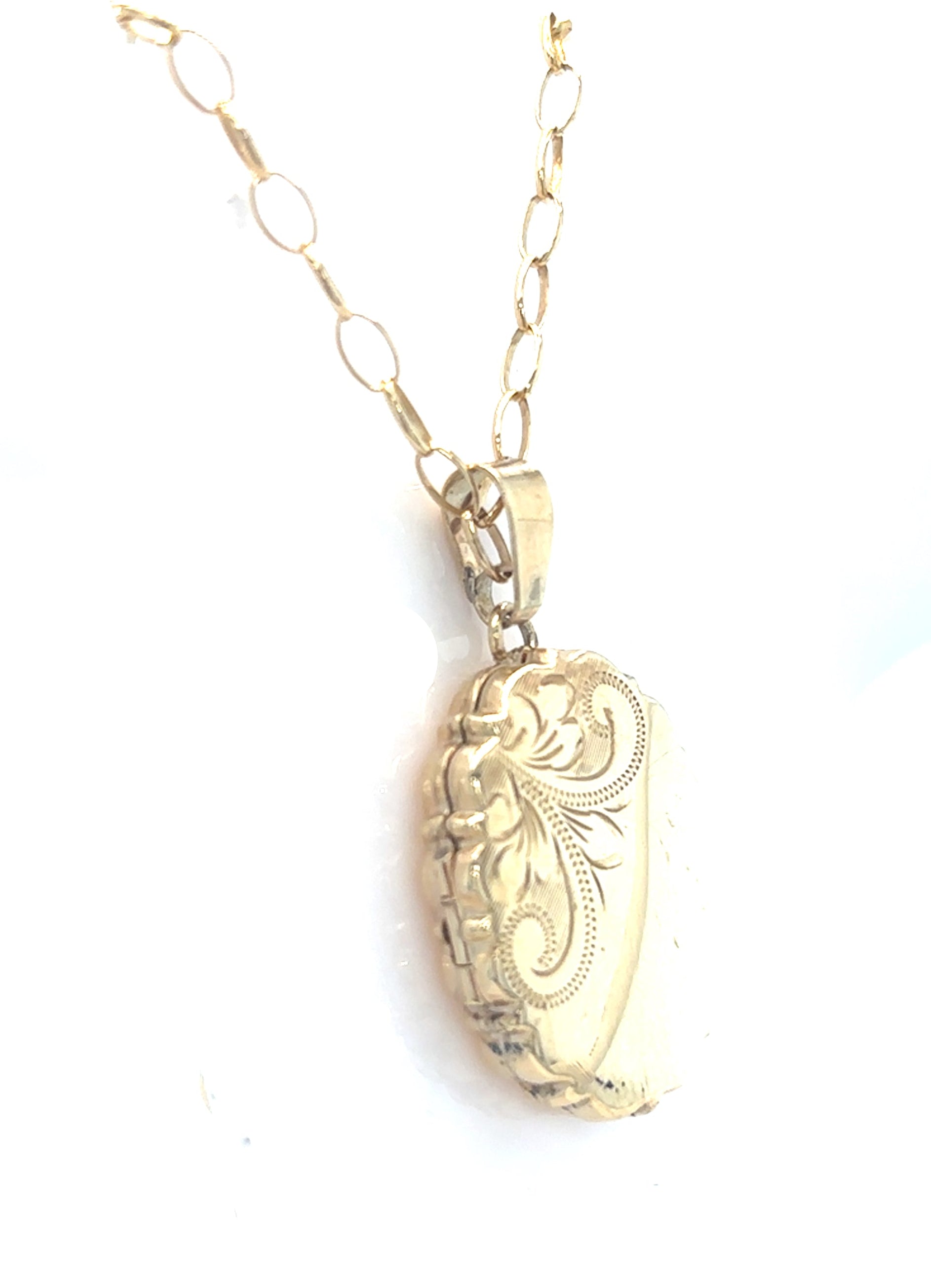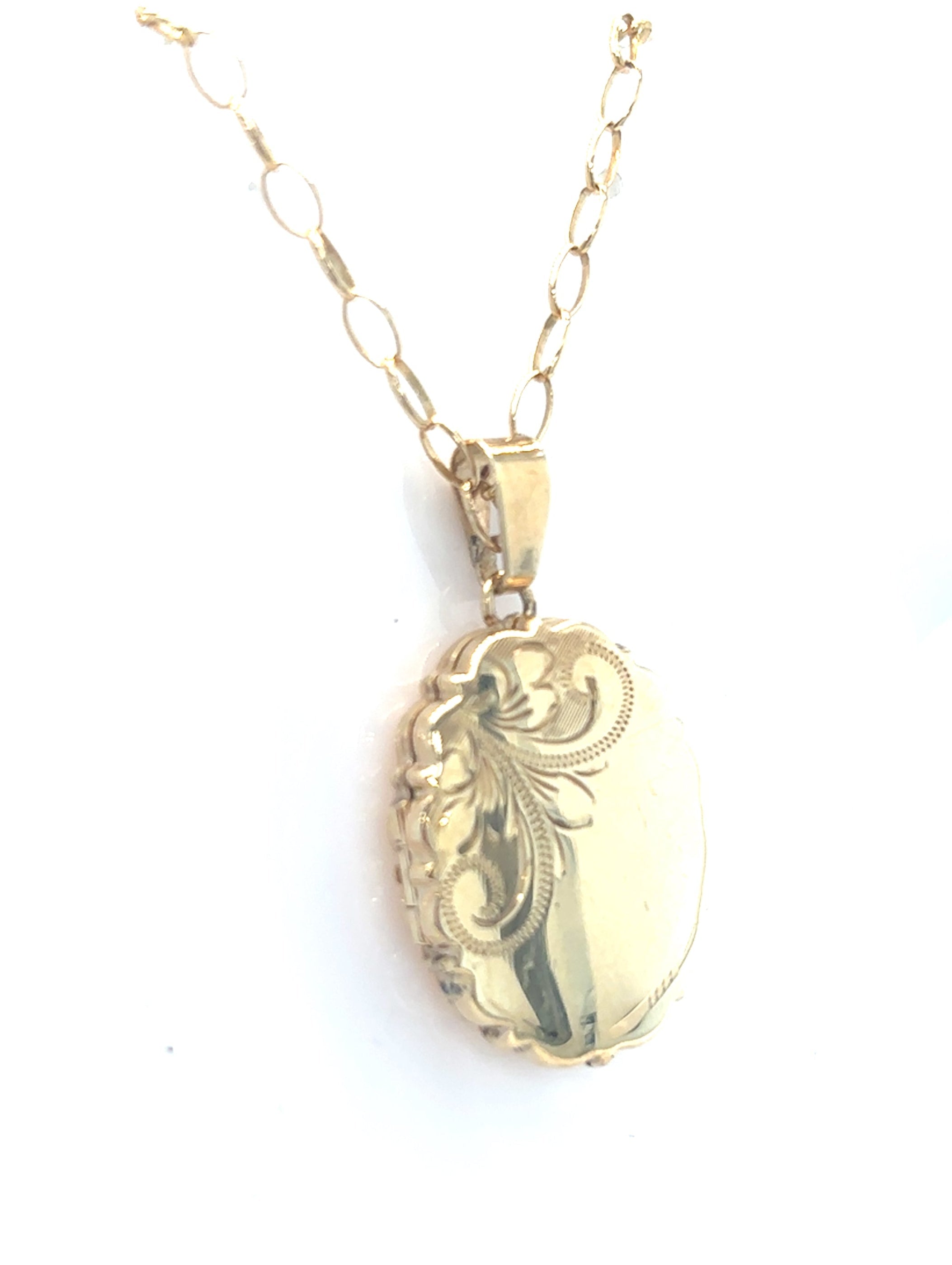 9ct Gold Oval Locket. Hand Engraved 25x20mm with 18" Belcher Chain. Photo Locket. Pre-Loved.