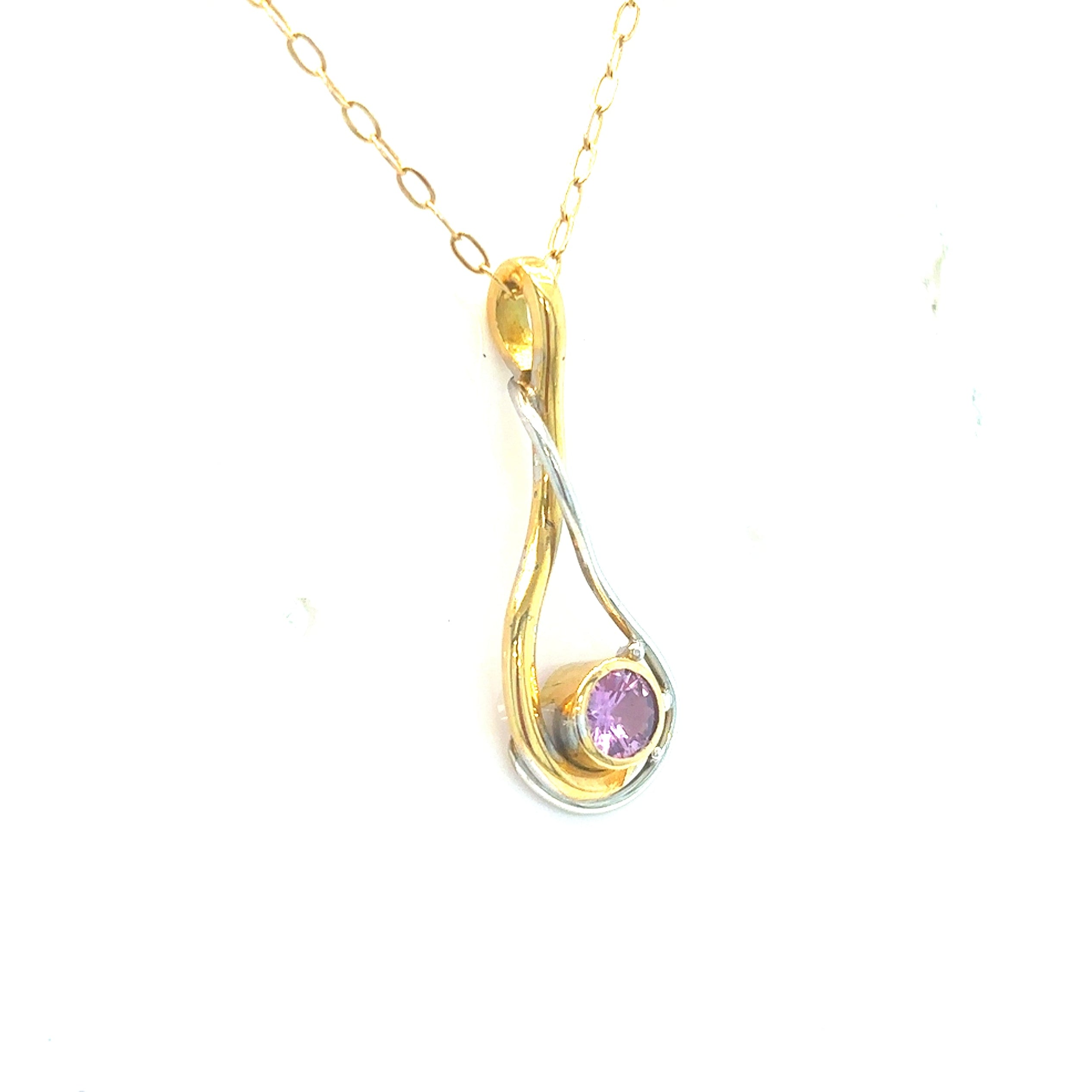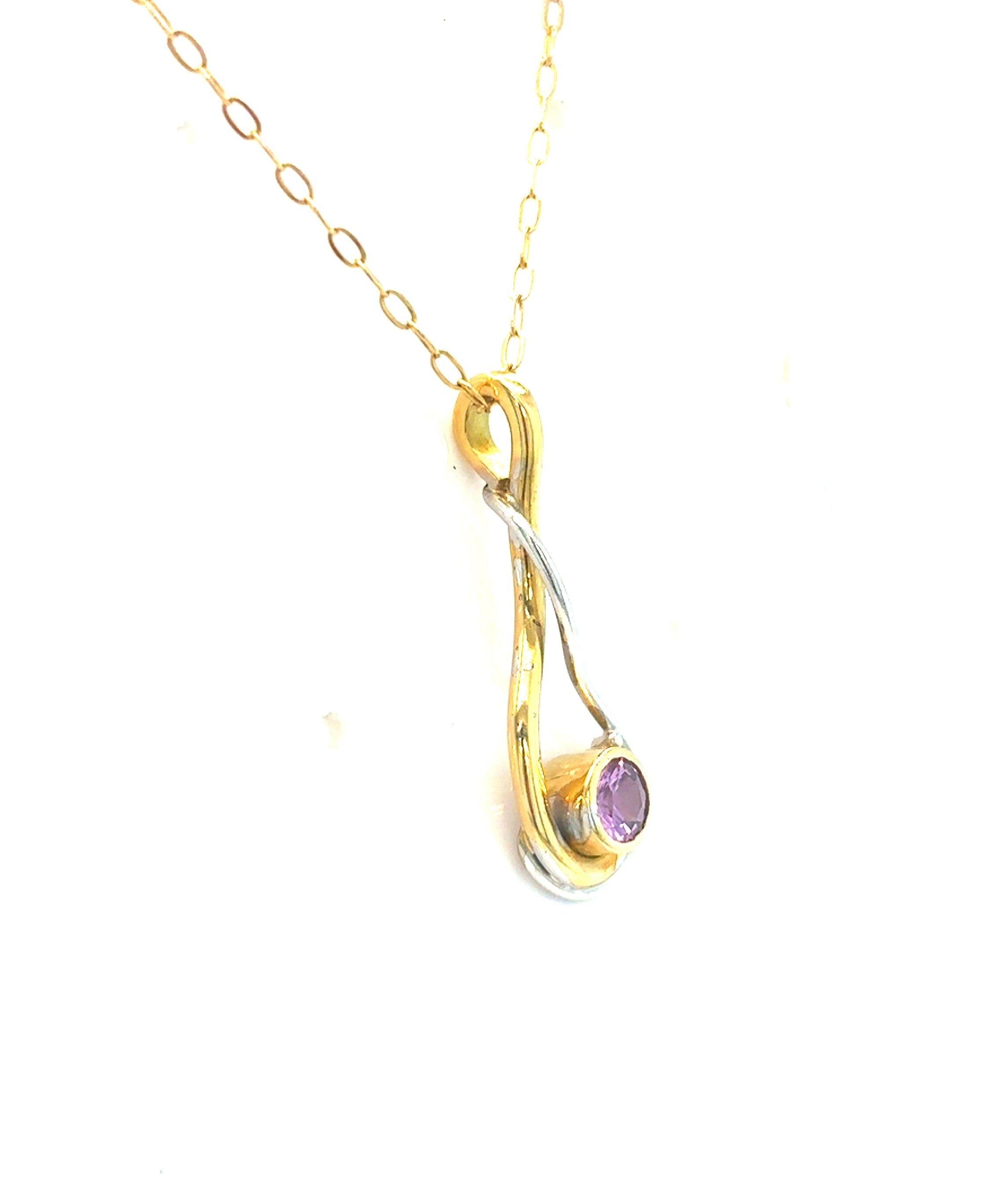 9ct Gold Amethyst Pendant Two Colour Twist Design 25x9mm with 22" Chain. Pre- Loved.