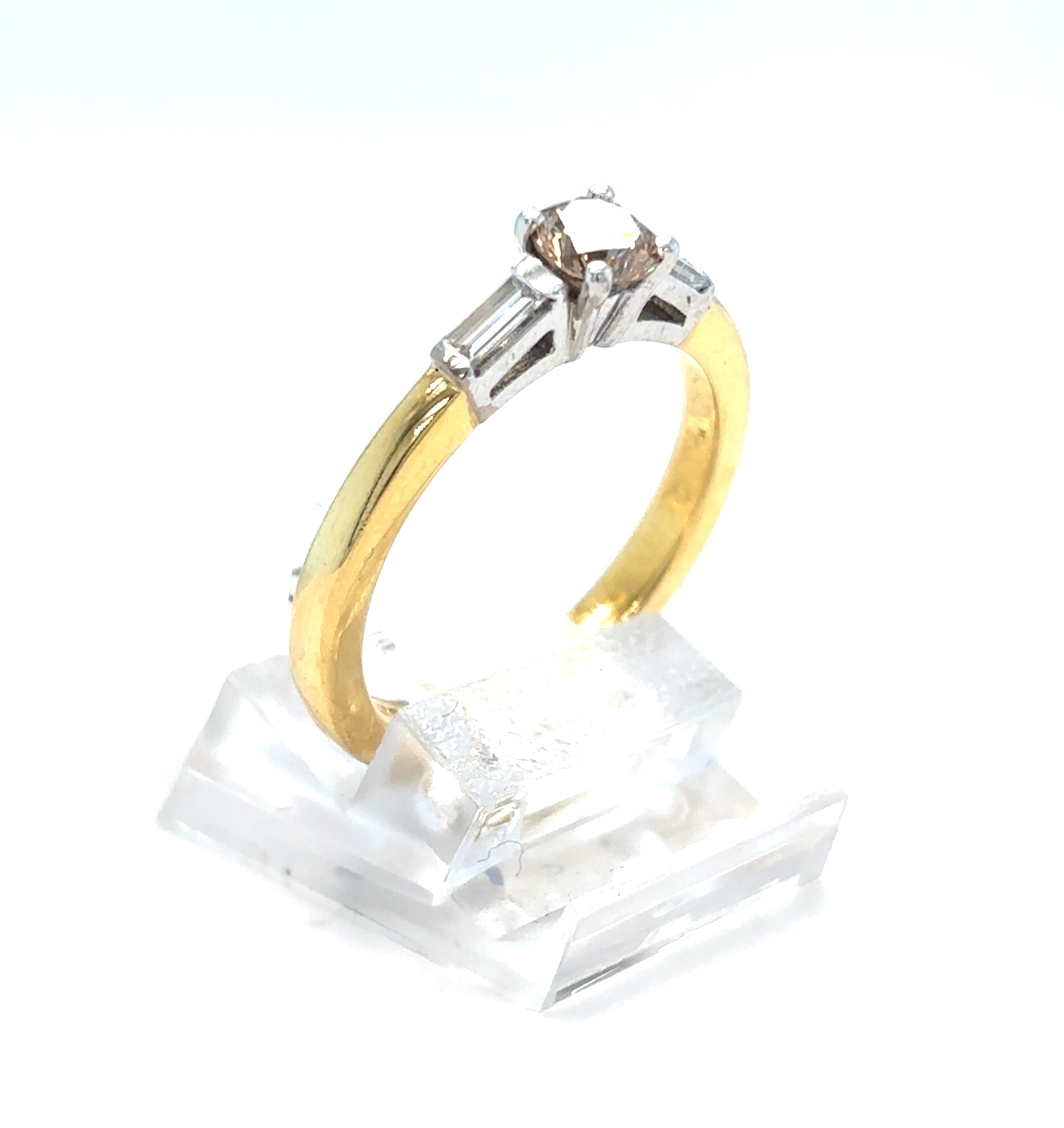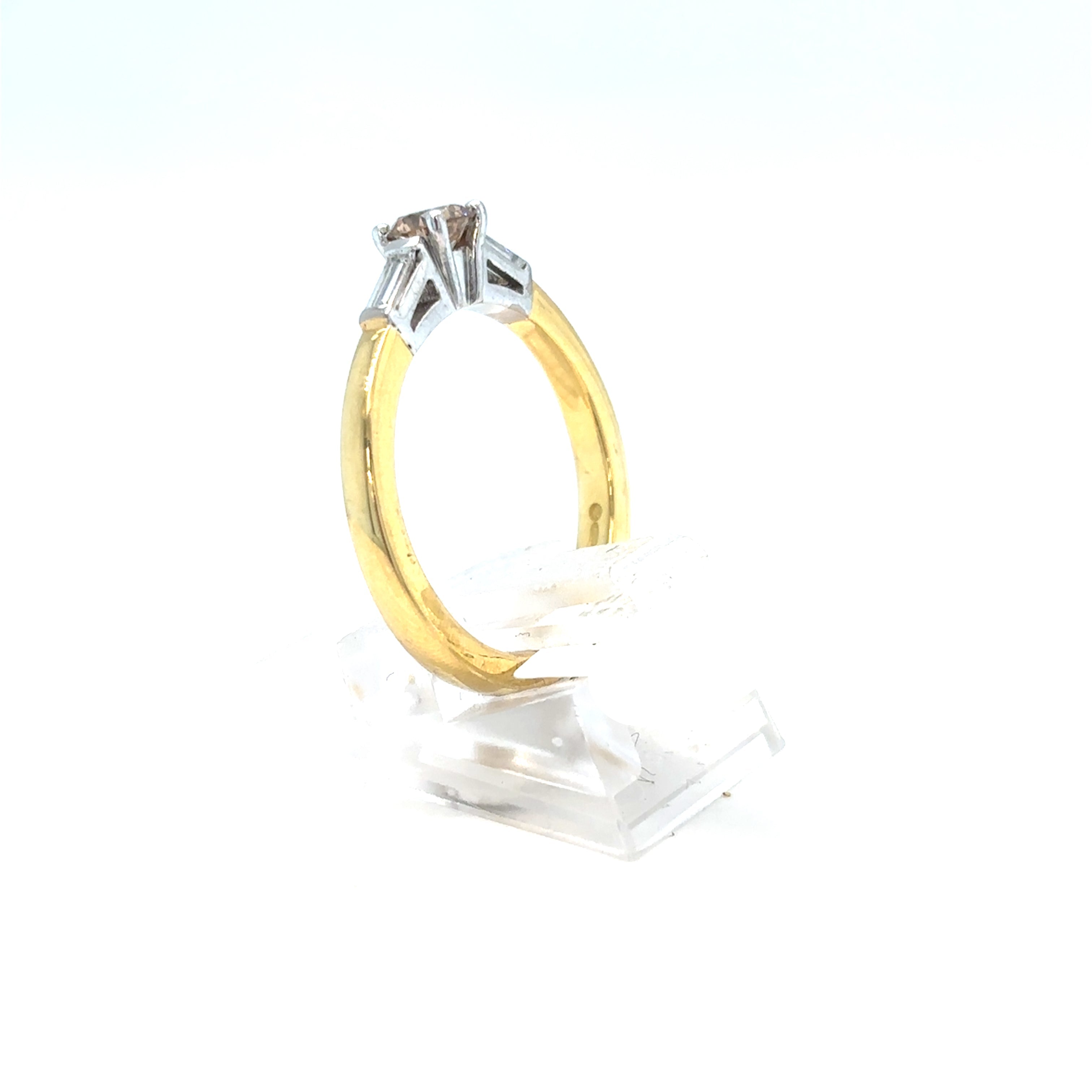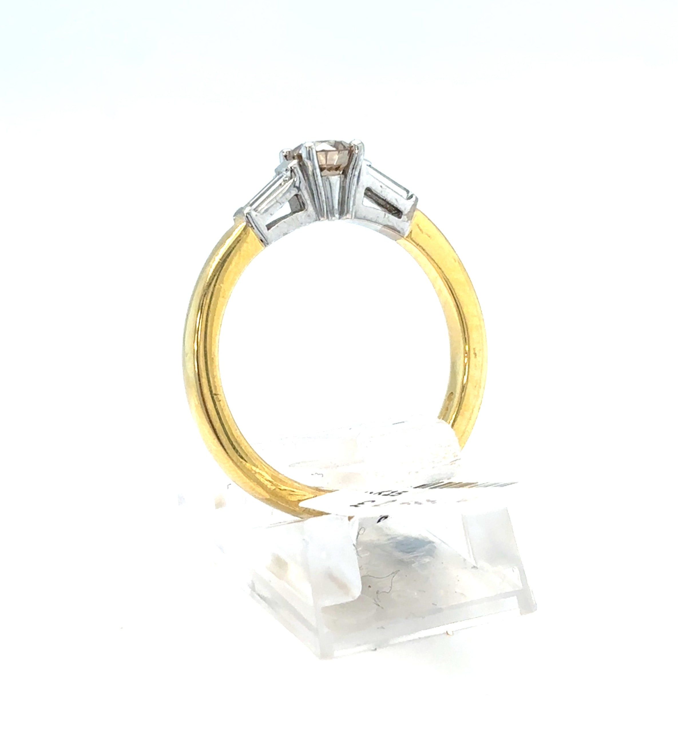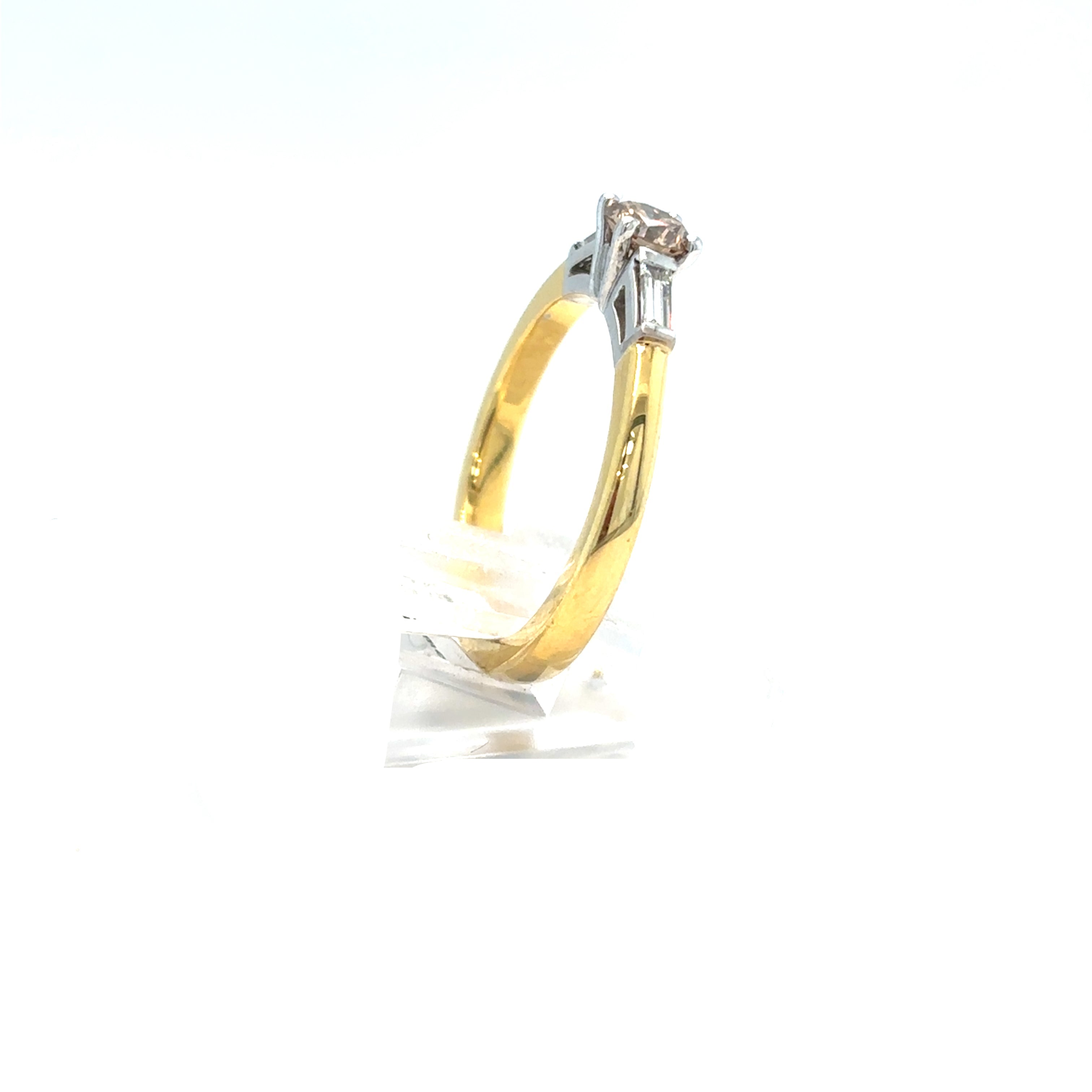 The ring features a beautiful 0.61ct brilliant-cut champagne diamond as the centre stone, perfectly complemented by two tapering baguette-cut diamonds set to either side, enhancing sparkle and balance.