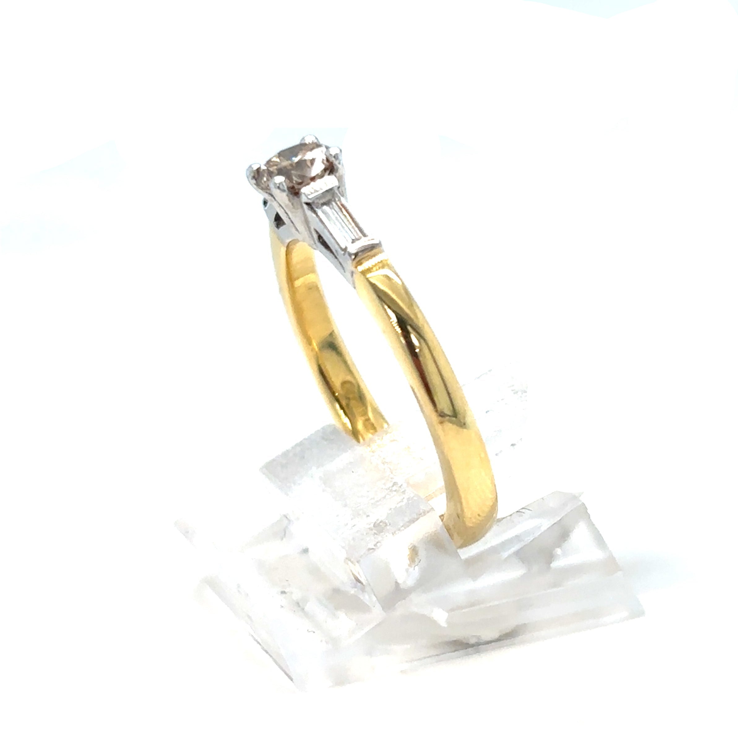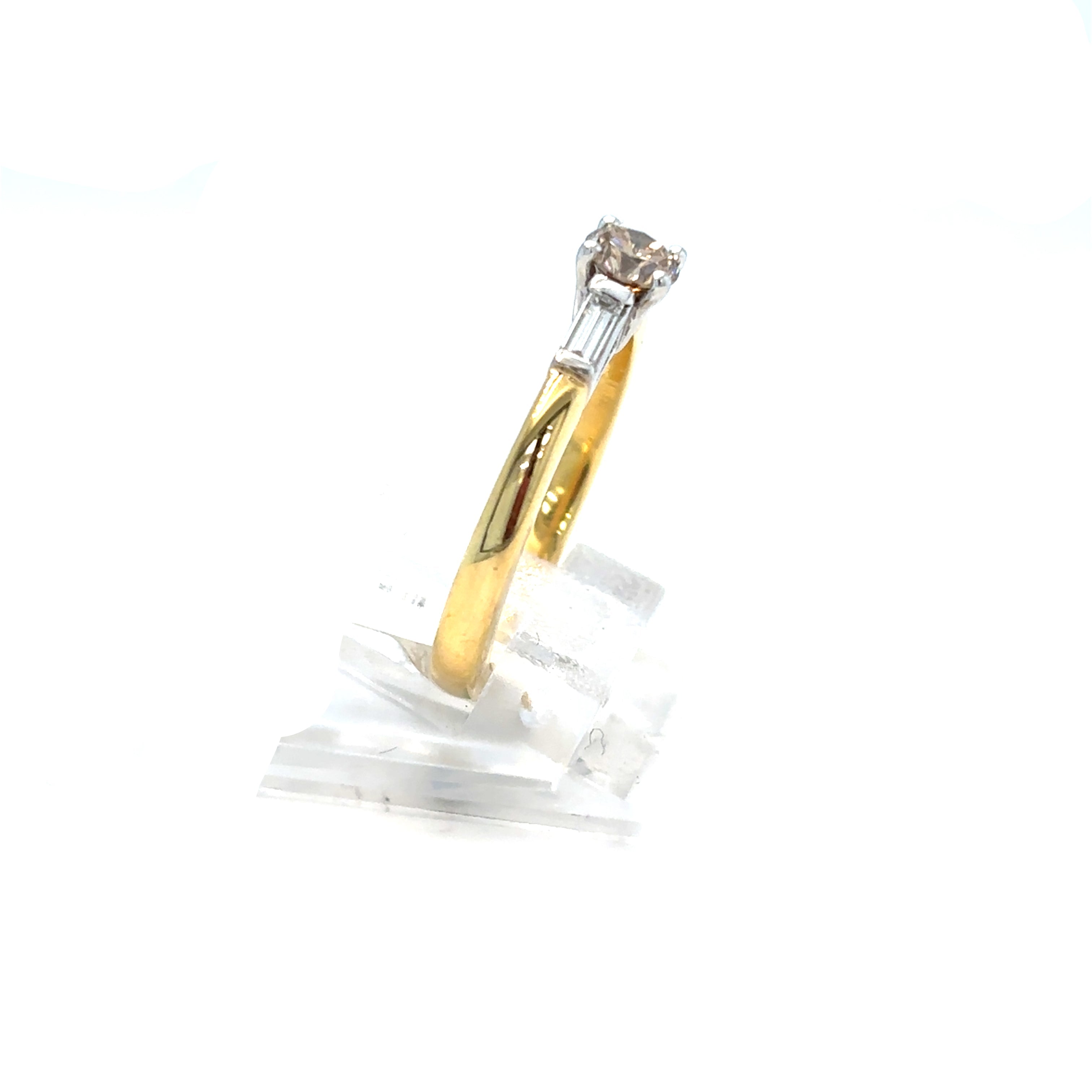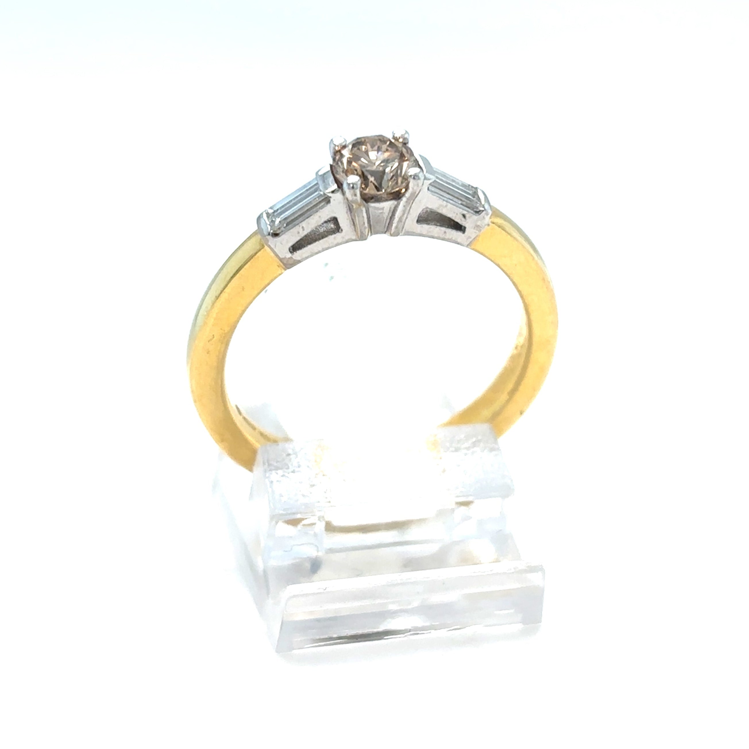 The ring features a beautiful 0.61ct brilliant-cut champagne diamond as the centre stone, perfectly complemented by two tapering baguette-cut diamonds set to either side, enhancing sparkle and balance.