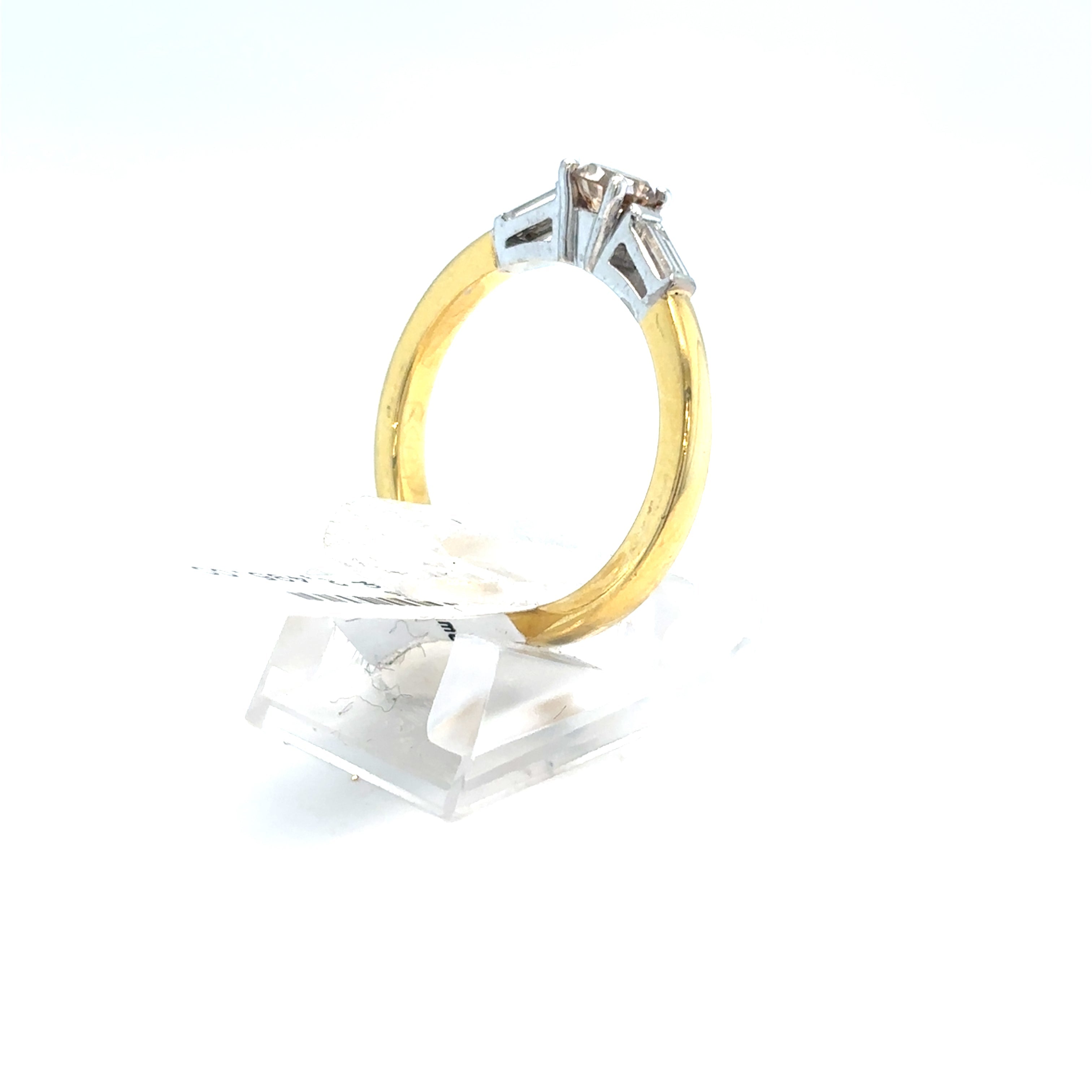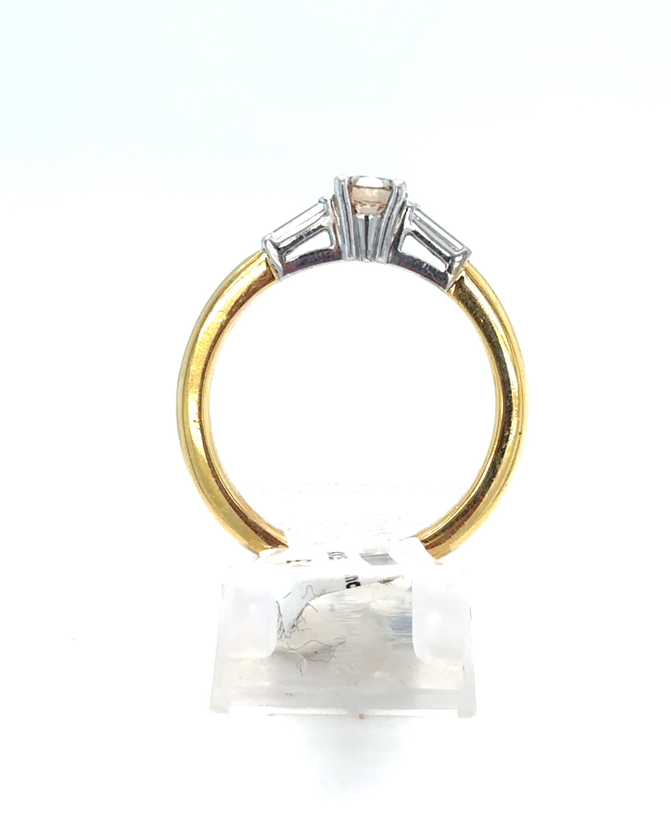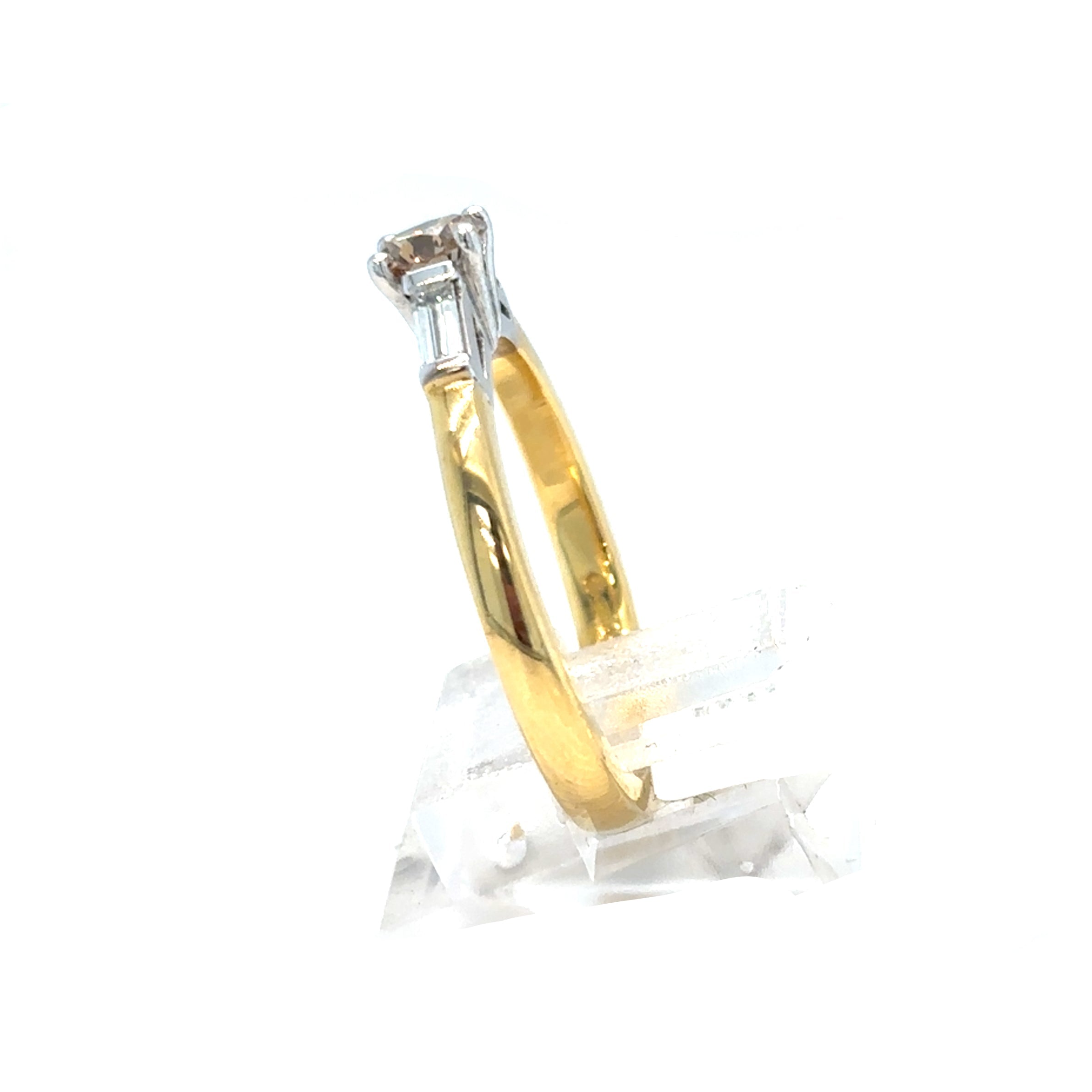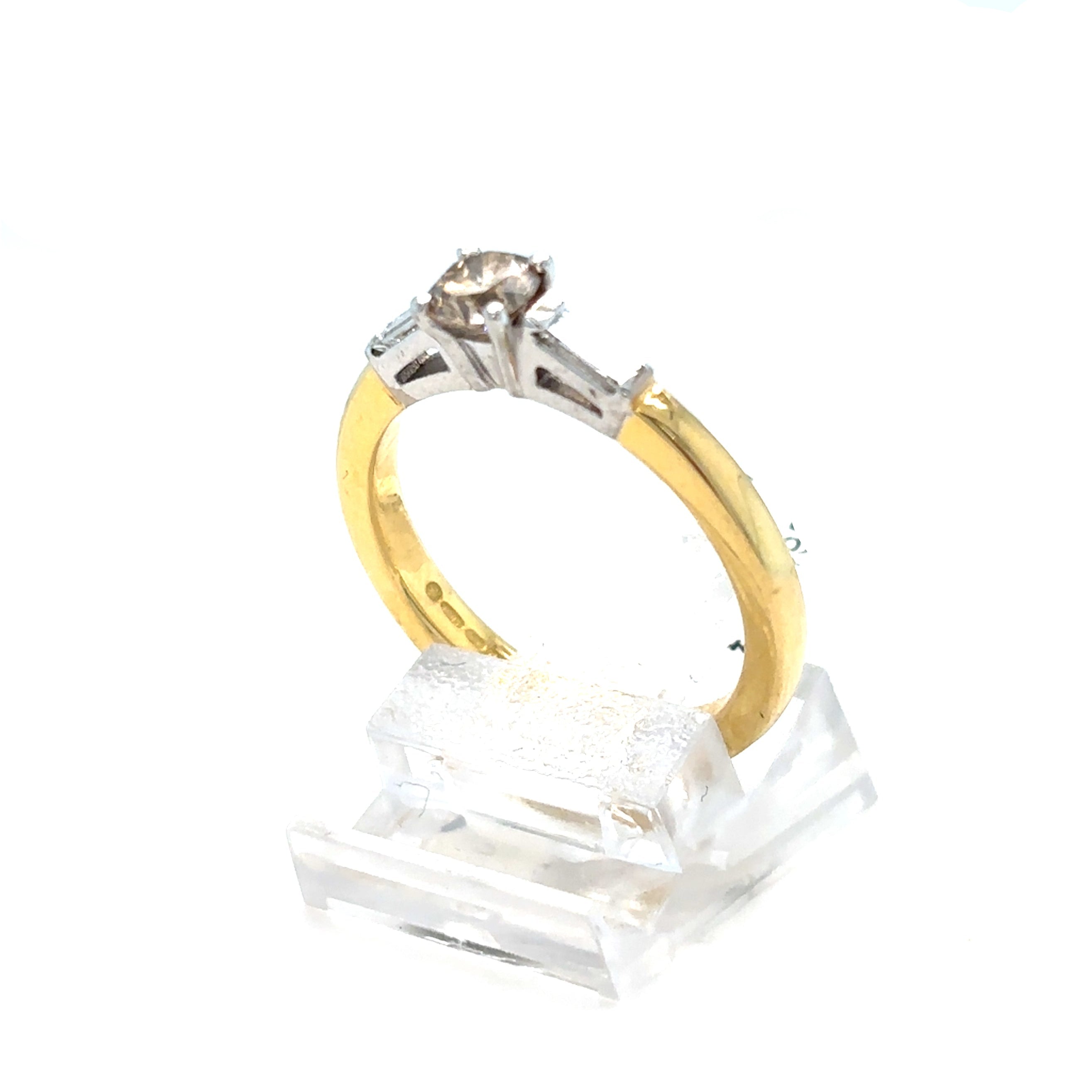 The ring features a beautiful 0.61ct brilliant-cut champagne diamond as the centre stone, perfectly complemented by two tapering baguette-cut diamonds set to either side, enhancing sparkle and balance.