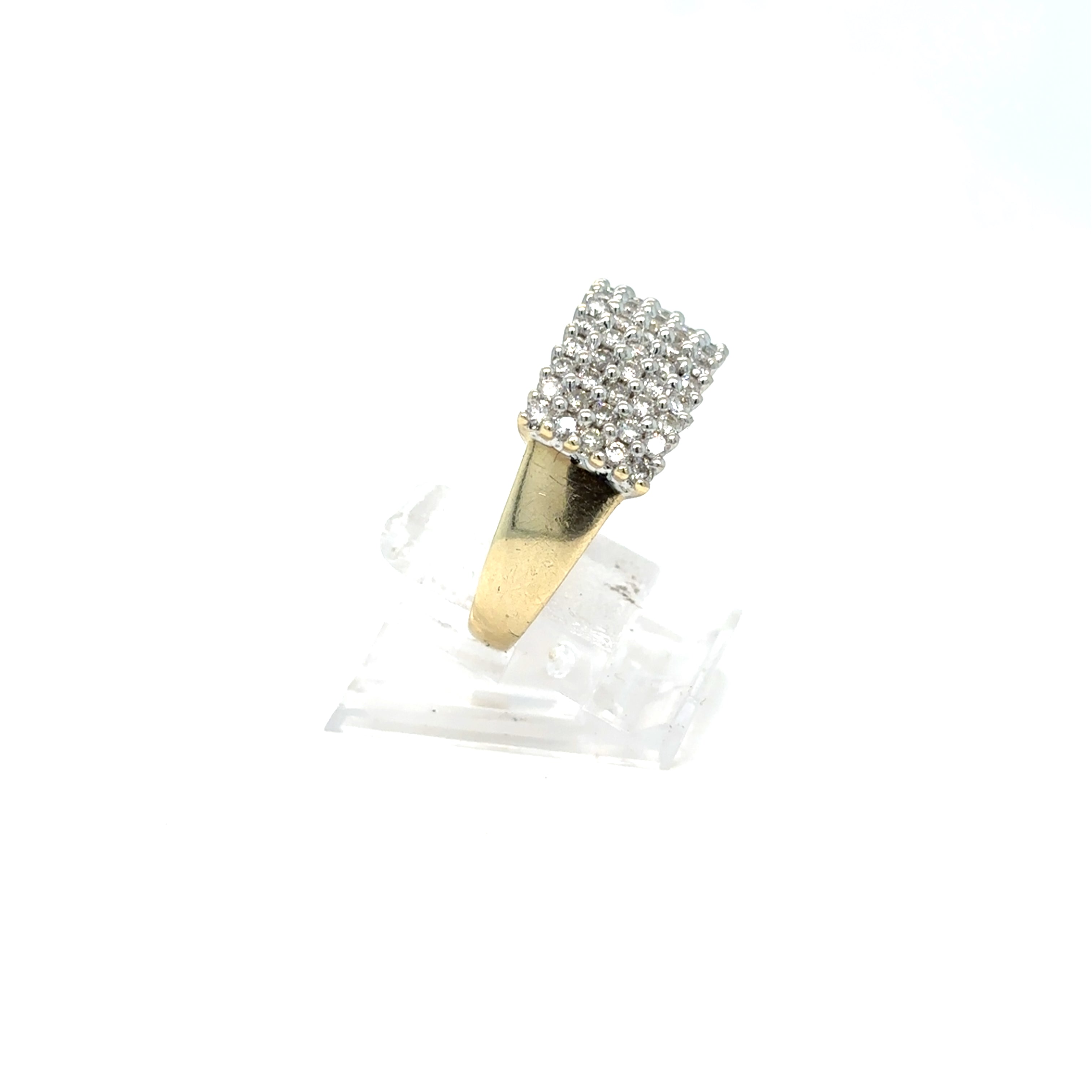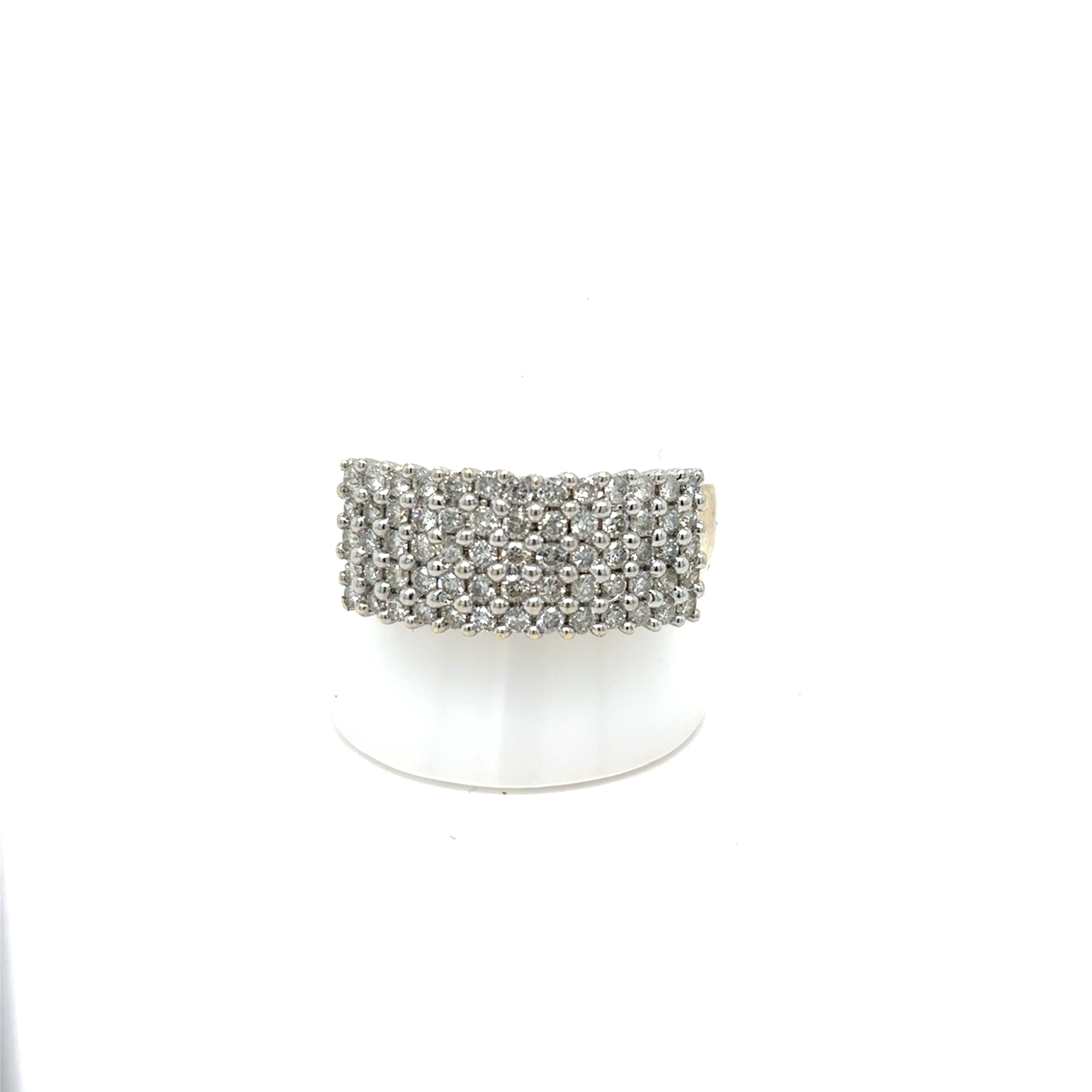 A dazzling statement piece, this 1 carat diamond dress ring is crafted in warm 9ct yellow gold and set with sixty-five brilliant cut diamonds. Arranged in five sparkling rows, the diamonds create a bold, light-catching display that exudes elegance and glamour. Perfect for special occasions or as a standout addition to any fine jewellery collection.