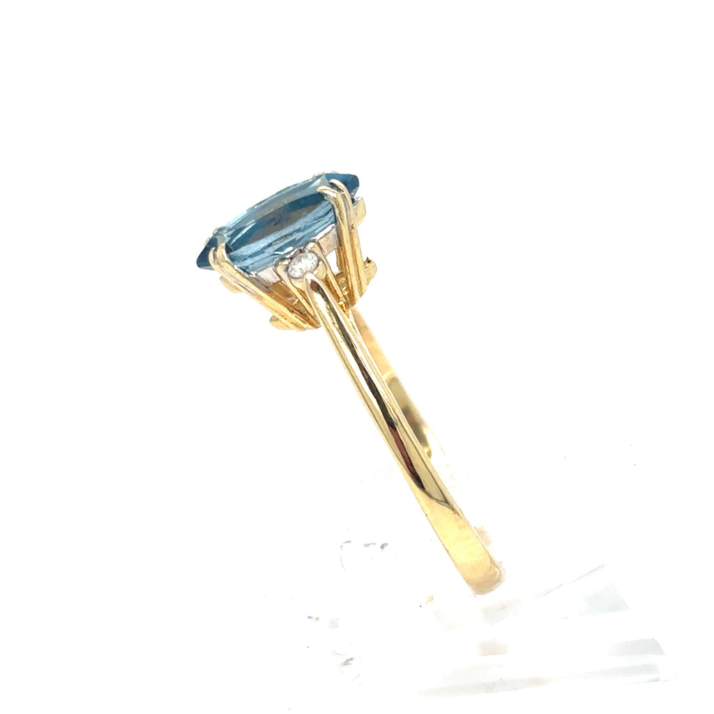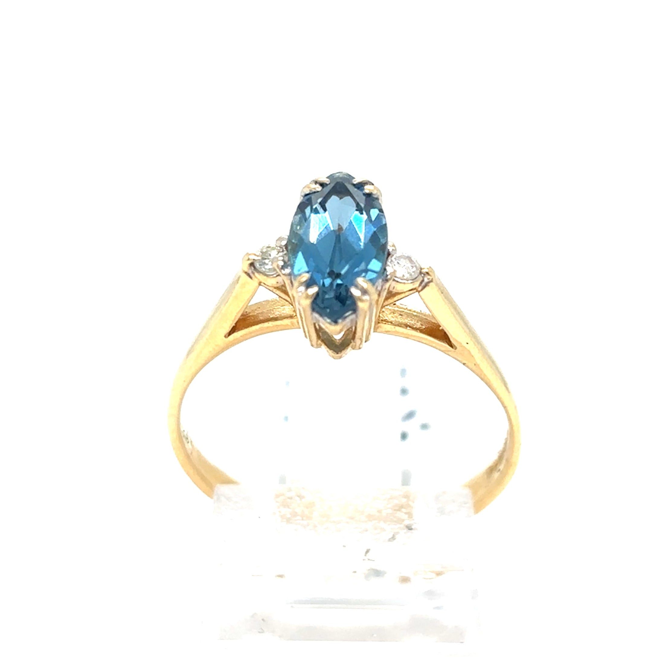 Elevate your jewellery collection with this exquisite 18ct Gold Marquise Blue Topaz & Diamond 3-Stone Ring. Crafted from luxurious 18-carat gold, this elegant piece features a striking marquise-cut blue topaz, perfectly complemented by two sparkling diamonds on either side.