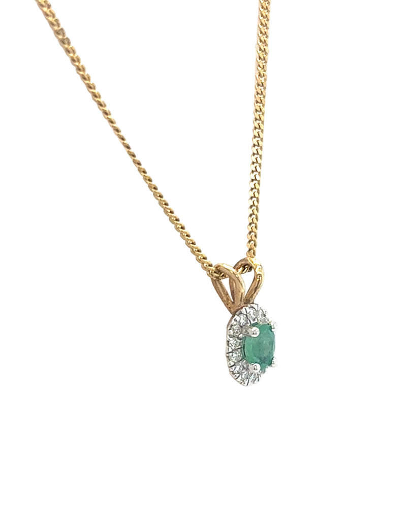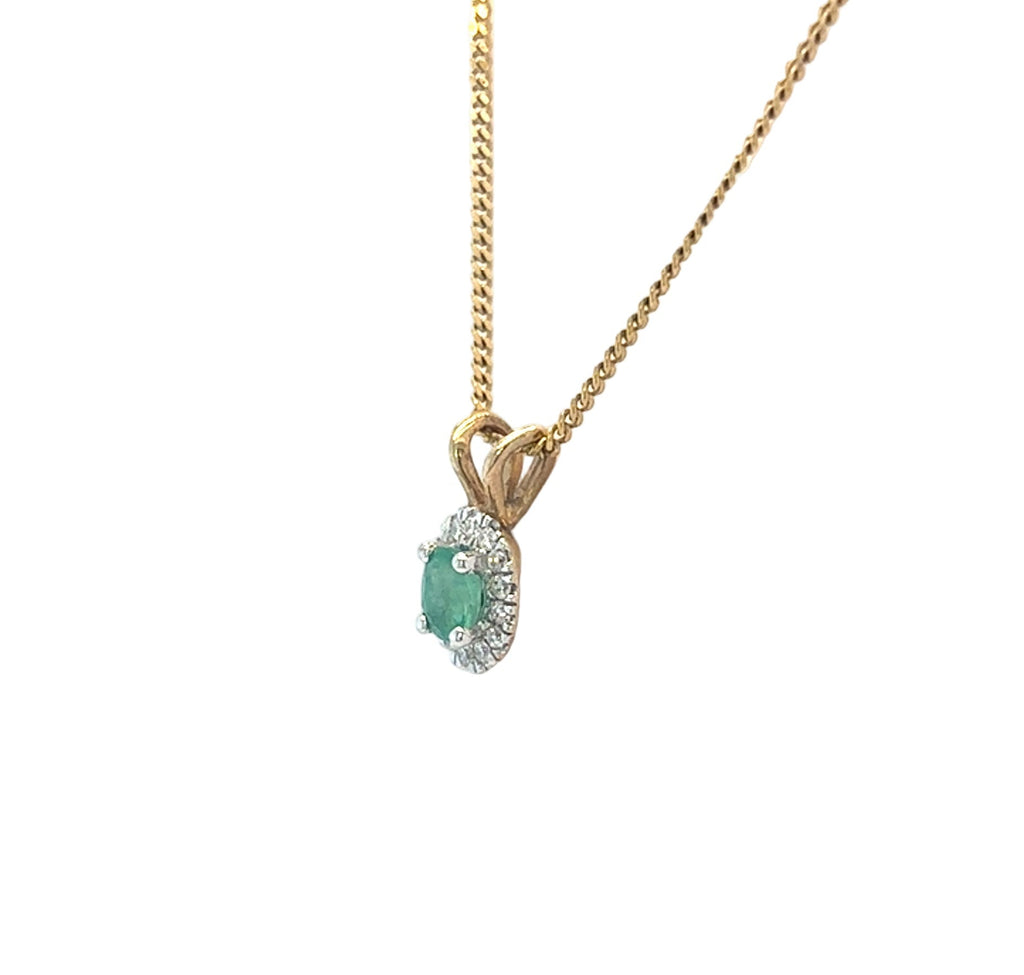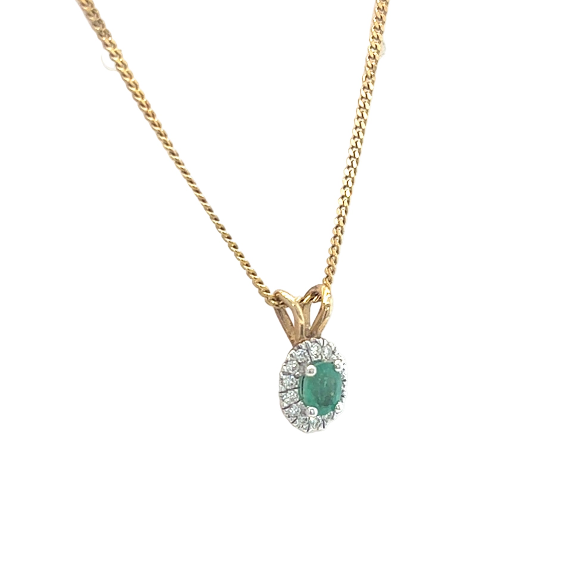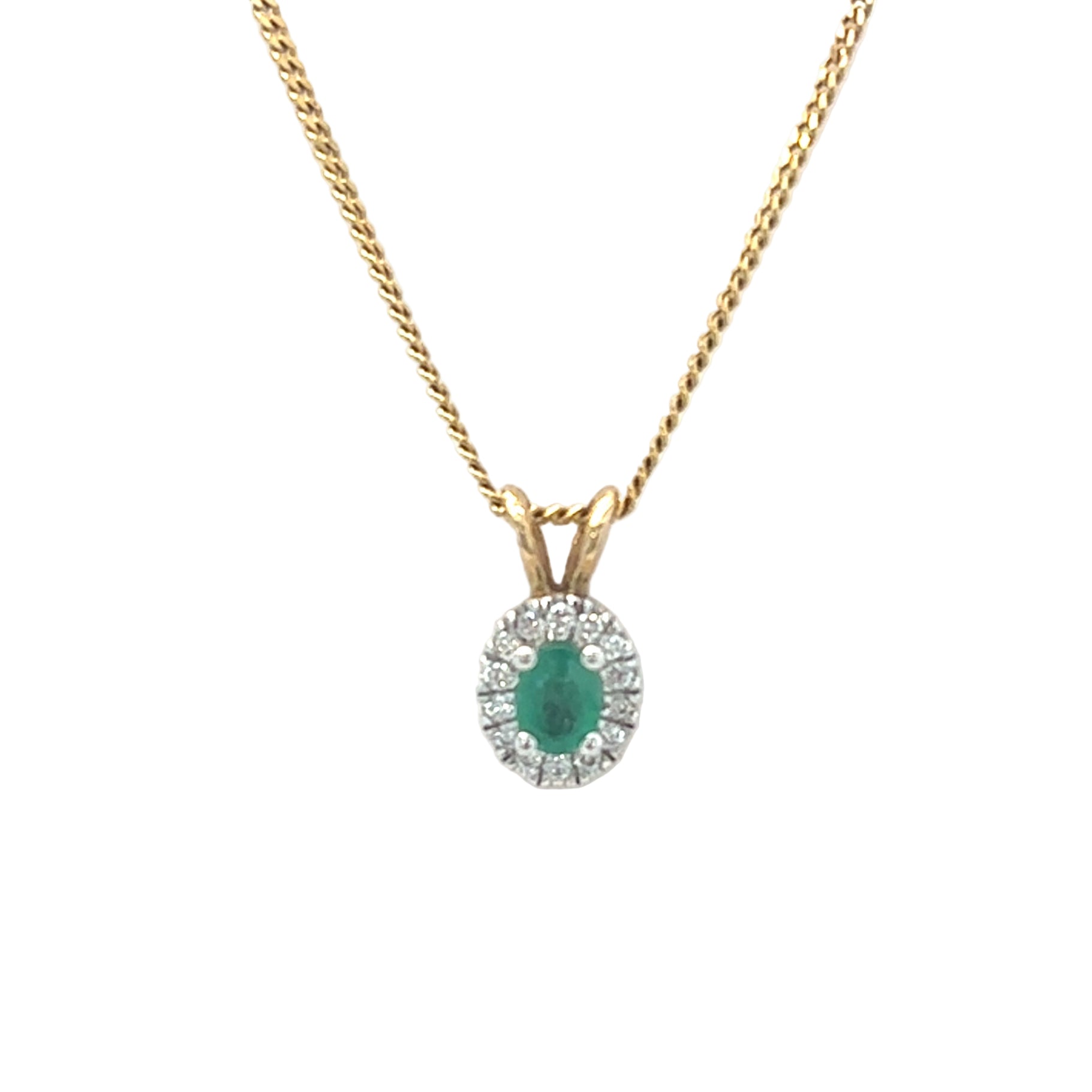 This elegant 9ct Gold Emerald & Diamond Halo Pendant features a vibrant 4x3mm oval-cut emerald, framed by a sparkling halo of brilliant-cut diamonds. The rich green of the emerald contrasts beautifully with the warm gold setting, creating a refined and timeless piece of jewellery.
