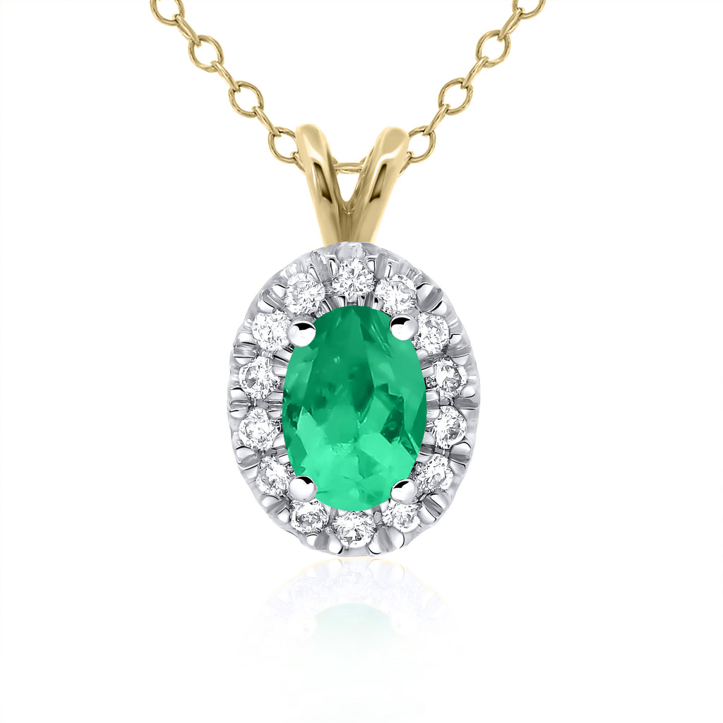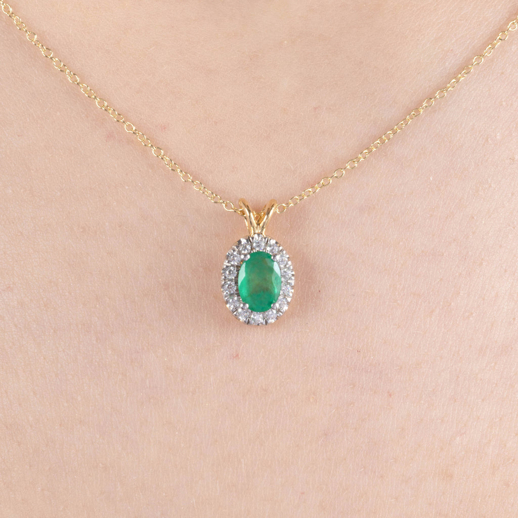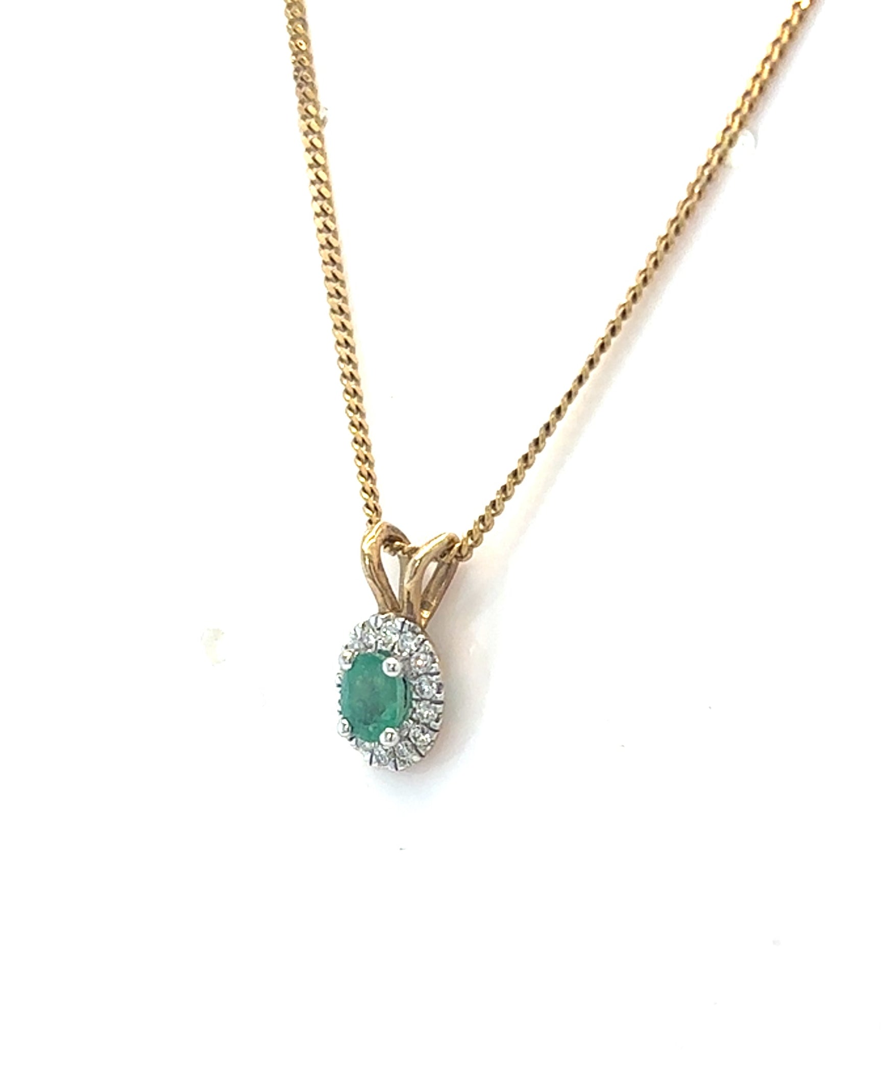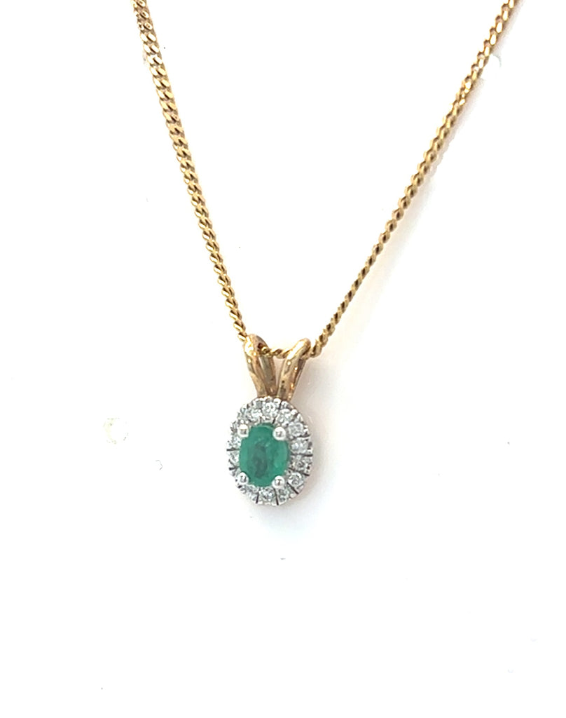 This elegant 9ct Gold Emerald & Diamond Halo Pendant features a vibrant 4x3mm oval-cut emerald, framed by a sparkling halo of brilliant-cut diamonds. The rich green of the emerald contrasts beautifully with the warm gold setting, creating a refined and timeless piece of jewellery.