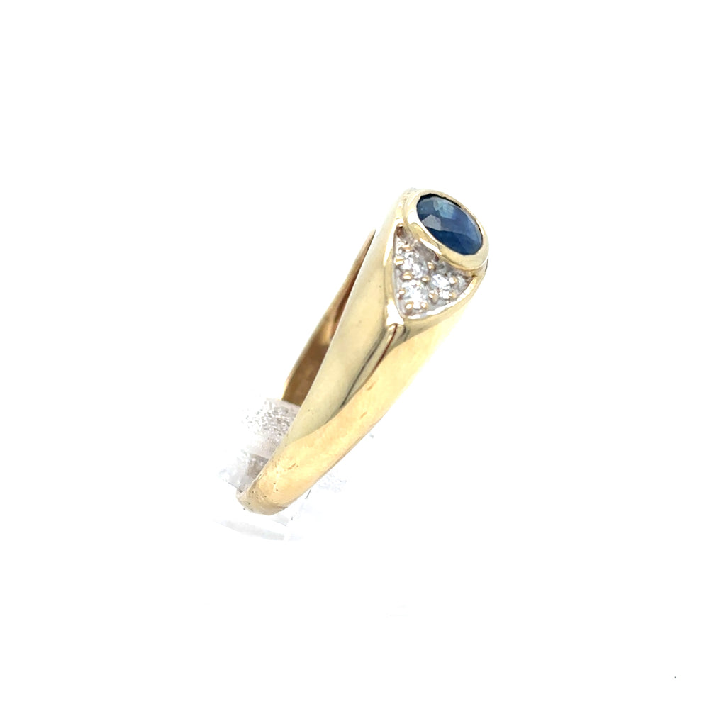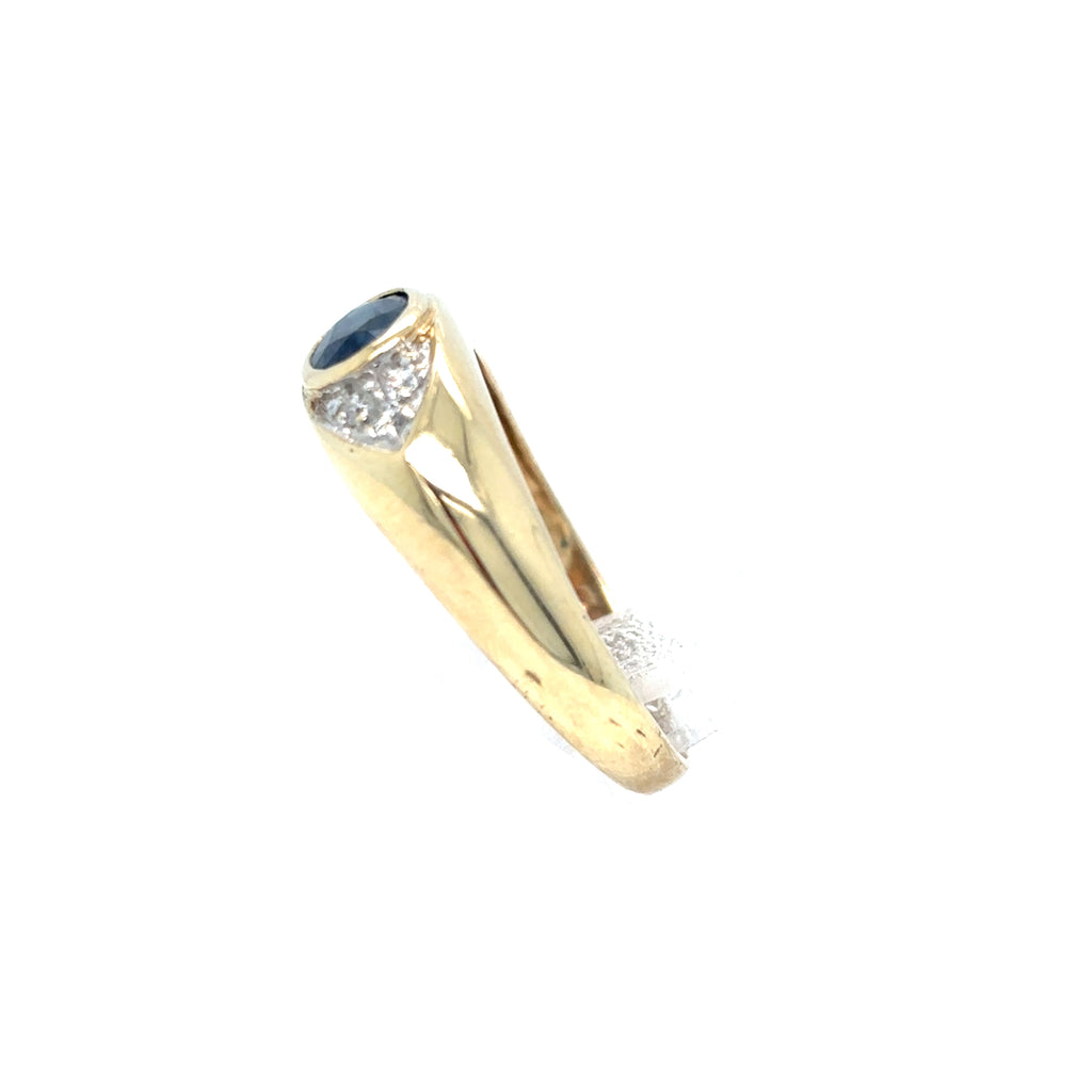 Pre-Loved 9ct Yellow Gold Sapphire & Diamond Boat Style Ring. Oval Sapphire. Size T.