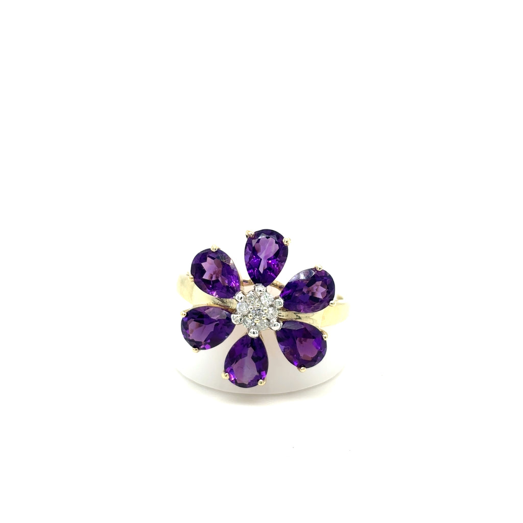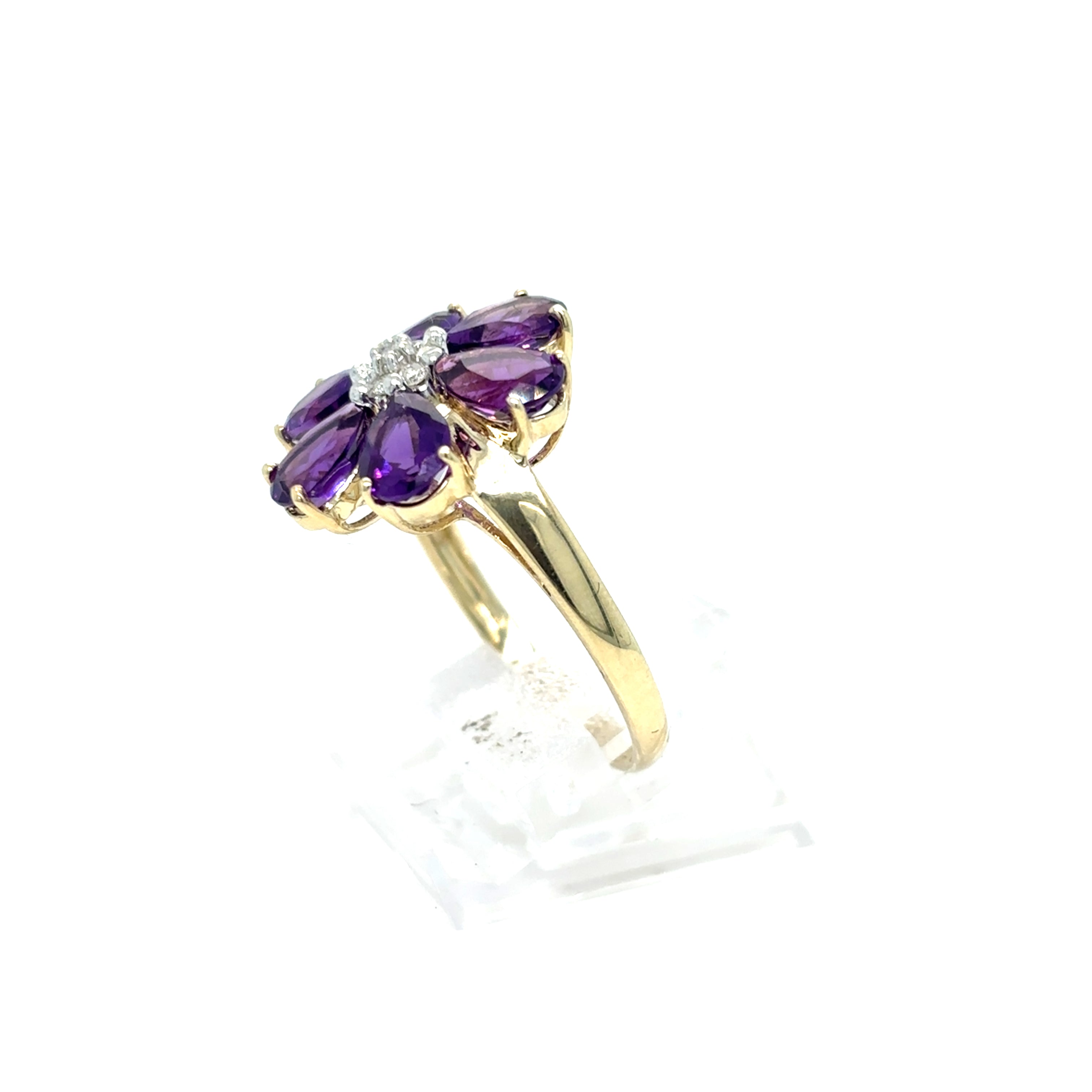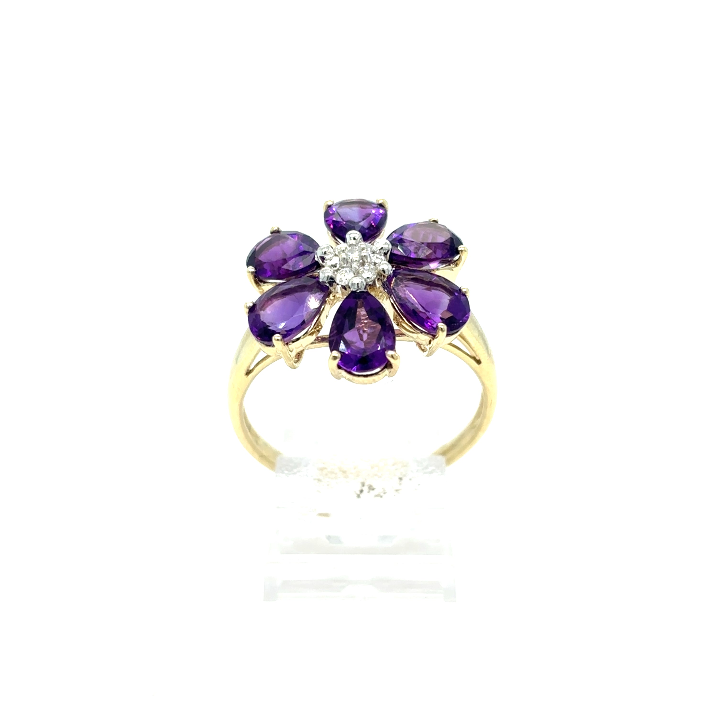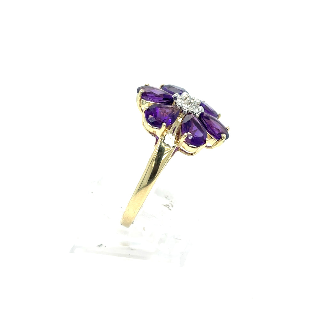 A beautifully crafted floral-inspired design, this striking dress ring features a central seven-stone diamond cluster surrounded by six vibrant pear-cut amethysts. The amethysts are arranged to form a graceful flower head, their rich purple tones perfectly complemented by the sparkle of the diamonds and the warmth of the 9ct yellow gold band. Elegant and eye-catching, this piece is perfect for special occasions or as a unique statement ring.