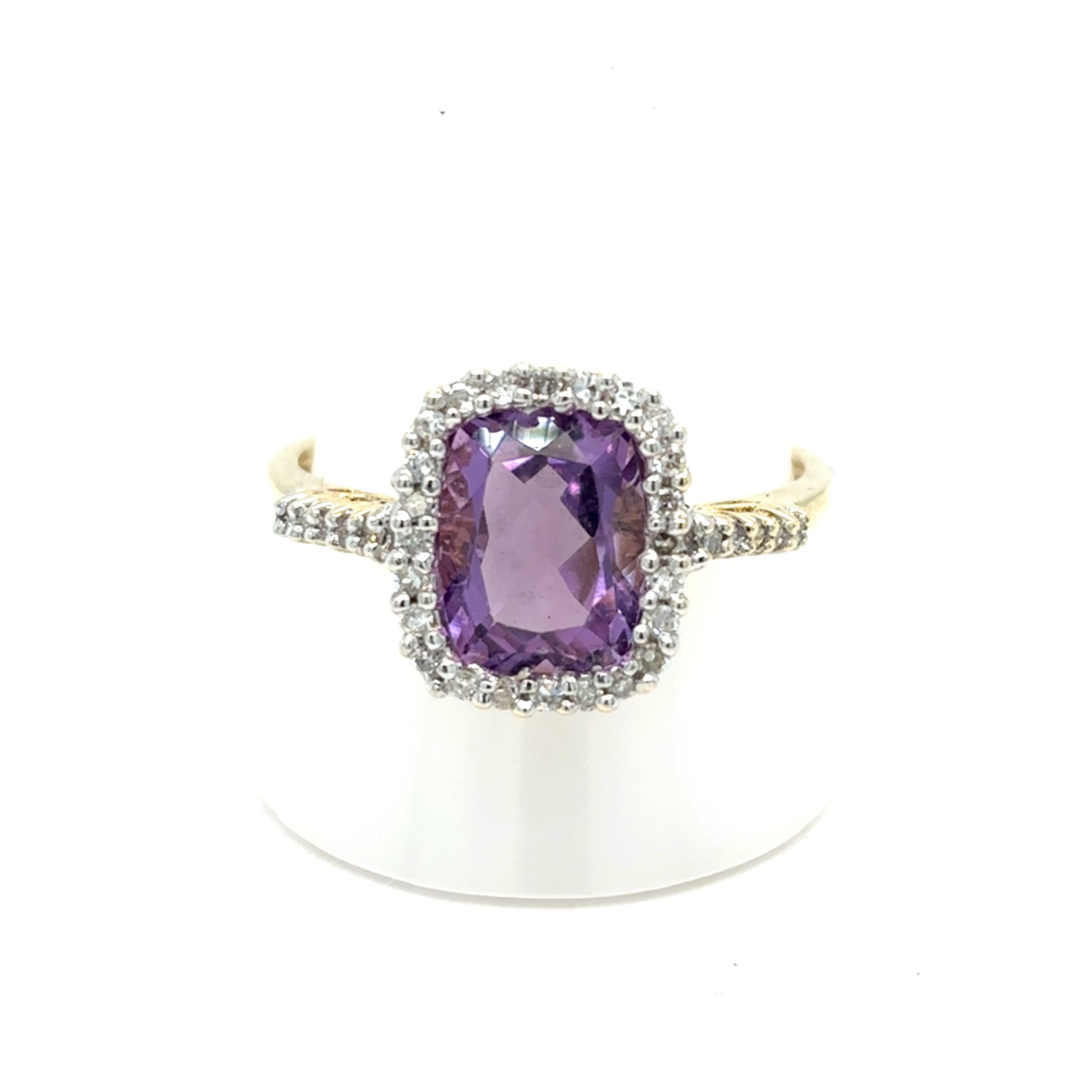 This elegant dress ring features a rich, cushion-cut amethyst at its centre, radiating vibrant purple hues. The central stone is beautifully surrounded by a sparkling halo of diamonds set in contrasting white gold, enhancing its colour and brilliance. Additional diamonds adorn the shoulders, adding further sparkle and sophistication. Crafted in 9ct yellow gold, this ring blends timeless elegance with luxurious detail—perfect for both special occasions and everyday glamour.