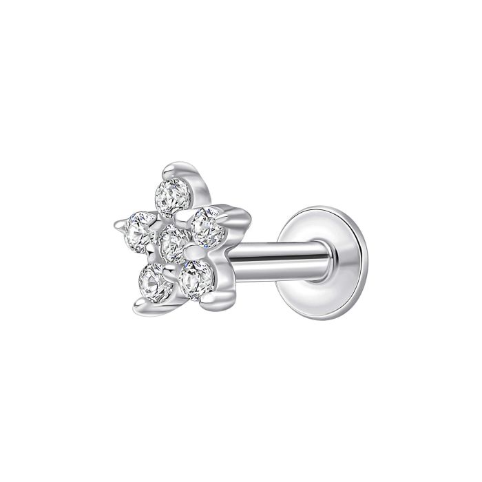 This Silver Flower Labret Stud Earring blends delicate design with lasting comfort. Crafted from recycled sterling silver, it showcases sparkling cubic zirconia in a floral pattern that adds a subtle touch of elegance. The internally threaded post and flat back ensure secure, comfortable wear — ideal for cartilage piercings. Sold individually, it offers versatile styling: wear alone for refined simplicity or combine with other studs for a personalized, blossoming look. Elevate your jewelry collection with this charming, eco-conscious piece that shines with understated beauty.